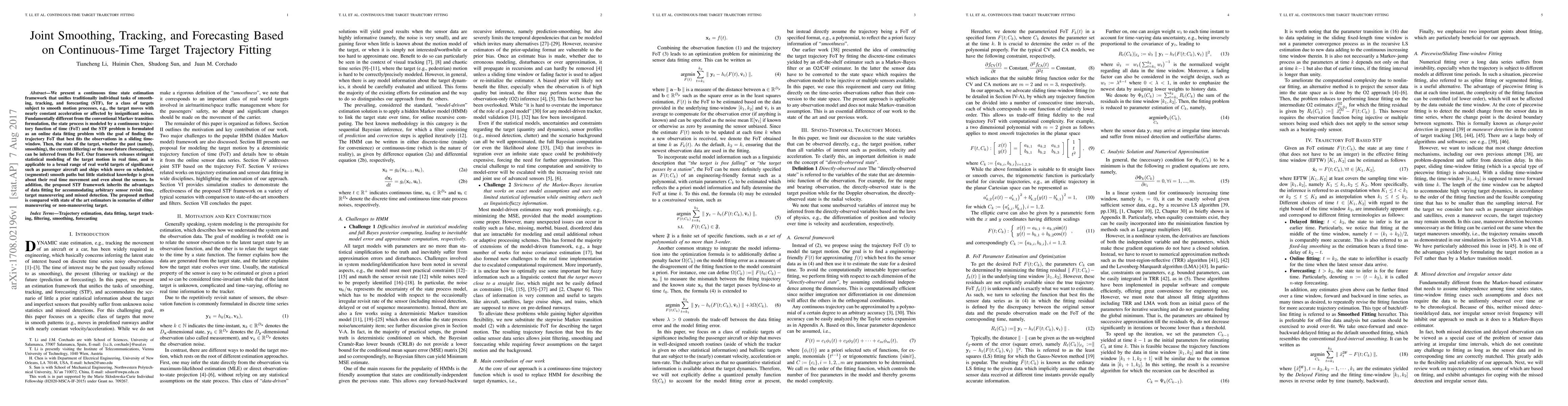 We present a continuous time state estimation framework that unifies traditionally individual tasks of smoothing, tracking, and forecasting (STF), for a class of targets subject to smooth motion processes, e.g., the target moves with nearly constant acceleration or affected by insignificant noises. Fundamentally different from the conventional Markov transition formulation, the state process is modeled by a continuous trajectory function of time (FoT) and the STF problem is formulated as an online data fitting problem with the goal of finding the trajectory FoT that best fits the observations in a sliding time-window. Then, the state of the target, whether the past (namely, smoothing), the current (filtering) or the near-future (forecasting), can be inferred from the FoT. Our framework releases stringent statistical modeling of the target motion in real time, and is applicable to a broad range of real world targets of significance such as passenger aircraft and ships which move on scheduled, (segmented) smooth paths but little statistical knowledge is given about their real time movement and even about the sensors. In addition, the proposed STF framework inherits the advantages of data fitting for accommodating arbitrary sensor revisit time, target maneuvering and missed detection. The proposed method is compared with state of the art estimators in scenarios of either maneuvering or non-maneuvering target.