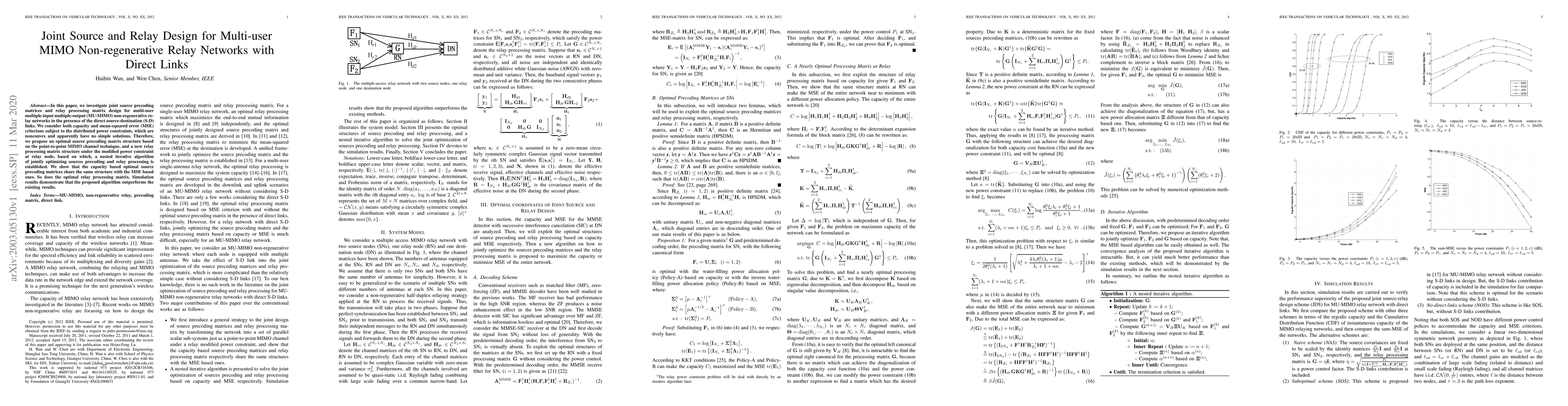 This paper proposes optimal joint source precoding and relay processing designs for multi-user MIMO non-regenerative relay networks with direct source-destination links, optimizing both capacity and mean-squared error under distributed power constraints. The proposed iterative algorithm demonstrates superior performance compared to existing methods.