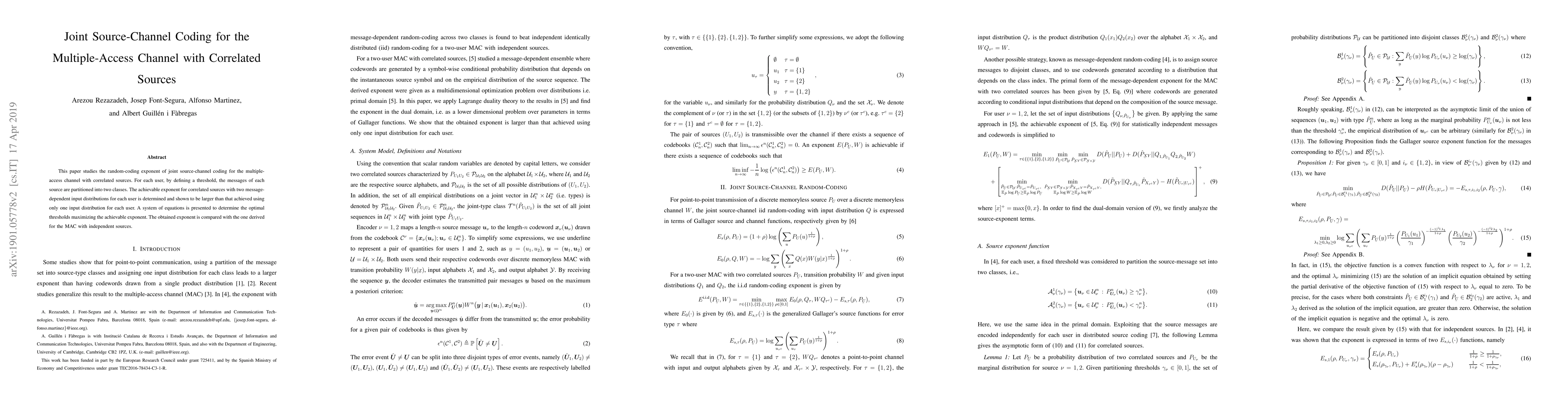 This paper investigates the random-coding exponent for joint source-channel coding in a multiple-access channel with correlated sources, demonstrating that partitioning messages into two classes based on a threshold improves the achievable exponent over using a single input distribution. An optimal threshold system is proposed to maximize the exponent.