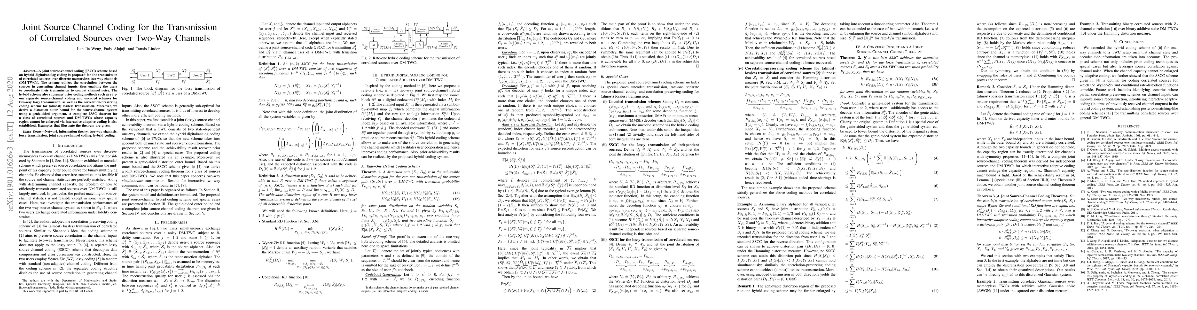This paper proposes a hybrid digital/analog joint source-channel coding scheme for correlated sources transmitted over discrete-memoryless two-way channels, utilizing source correlation to enhance transmission efficiency. The scheme encompasses prior methods and establishes a JSSC theorem for specific correlated sources and channels, with examples illustrating its application.
