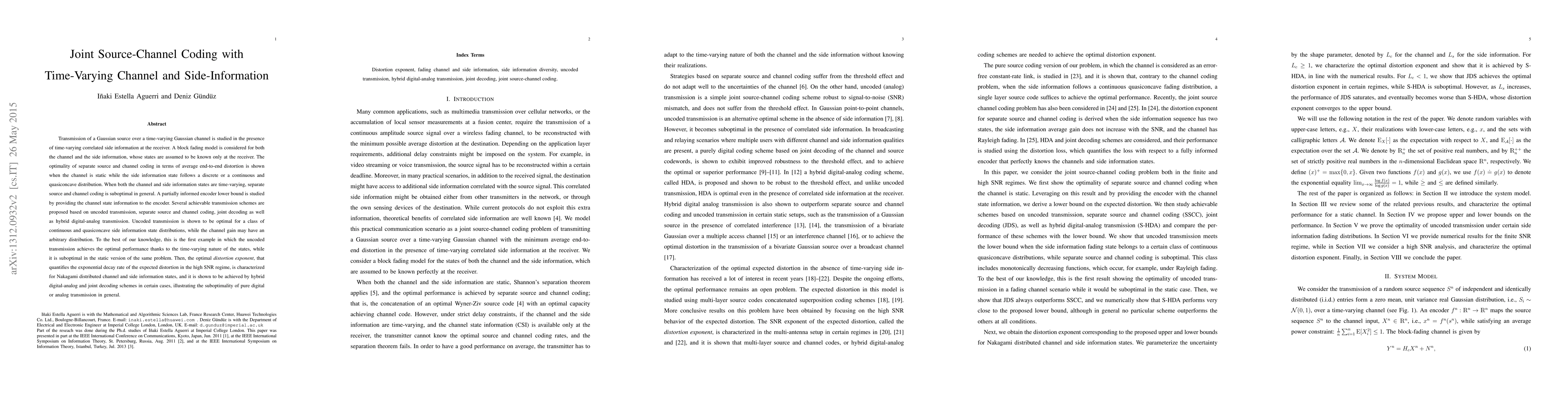 This paper investigates joint source-channel coding for a Gaussian source over a time-varying Gaussian channel with time-varying correlated side information at the receiver. It shows that separate source and channel coding is optimal when the channel is static, but suboptimal when both channel and side information states vary. Uncoded transmission is optimal for certain continuous side information distributions, while hybrid digital-analog and joint decoding schemes achieve the optimal distortion exponent for Nakagami distributed states.