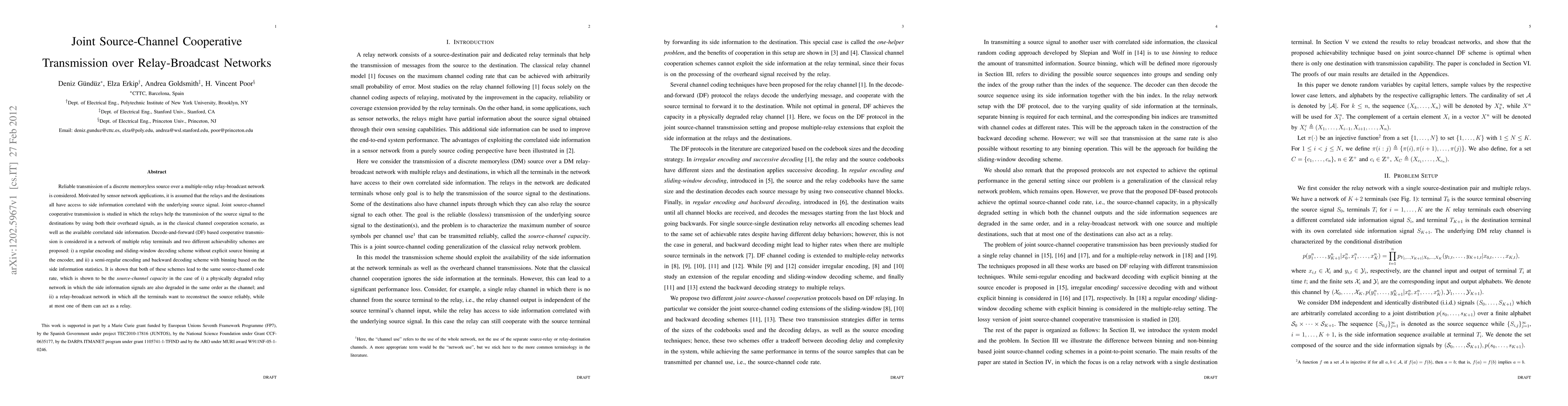 This paper explores joint source-channel cooperative transmission in multiple-relay relay-broadcast networks, proposing two decode-and-forward based schemes that leverage both overheard signals and correlated side information. Both schemes achieve the same source-channel capacity under specific network conditions.