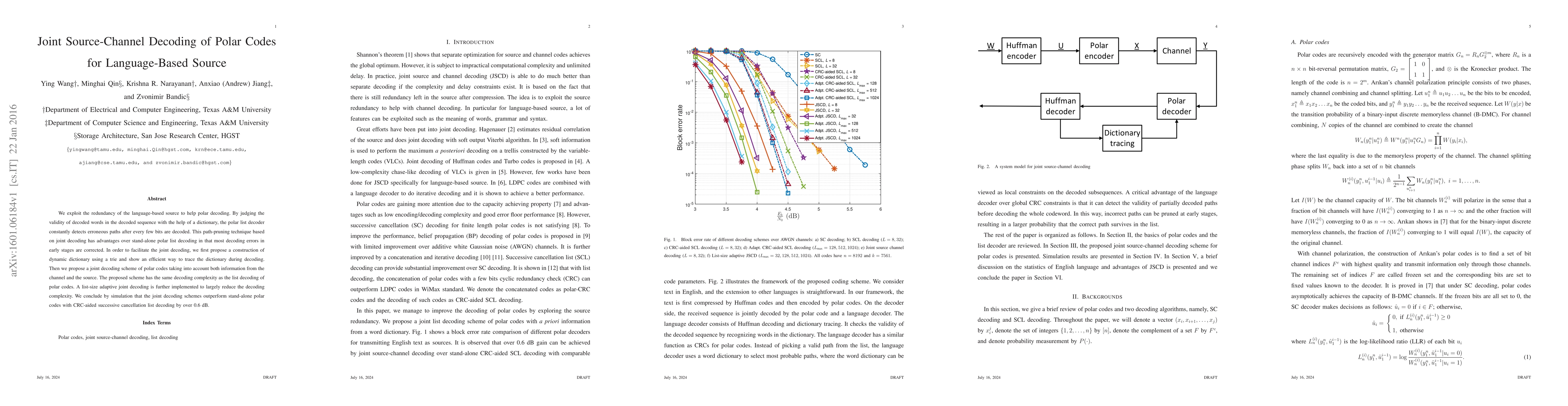This paper proposes a joint source-channel decoding method for polar codes that leverages language-based source redundancy to improve decoding accuracy. The method uses a dynamic dictionary and a list-size adaptive joint decoding scheme to correct early decoding errors, achieving over 0.6 dB performance gain over stand-alone polar list decoding.