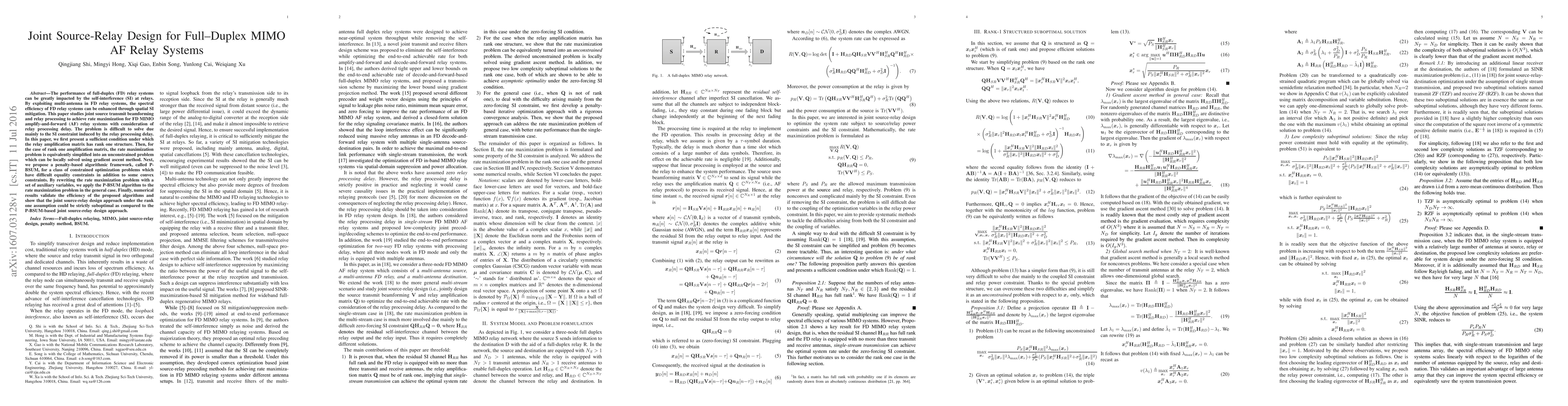 This paper investigates joint source-relay design for full-duplex MIMO AF relay systems, focusing on rate maximization through spatial self-interference mitigation. It proposes a penalty-based algorithmic framework, P-BSUM, to solve the rate maximization problem, demonstrating its efficiency through numerical results.
