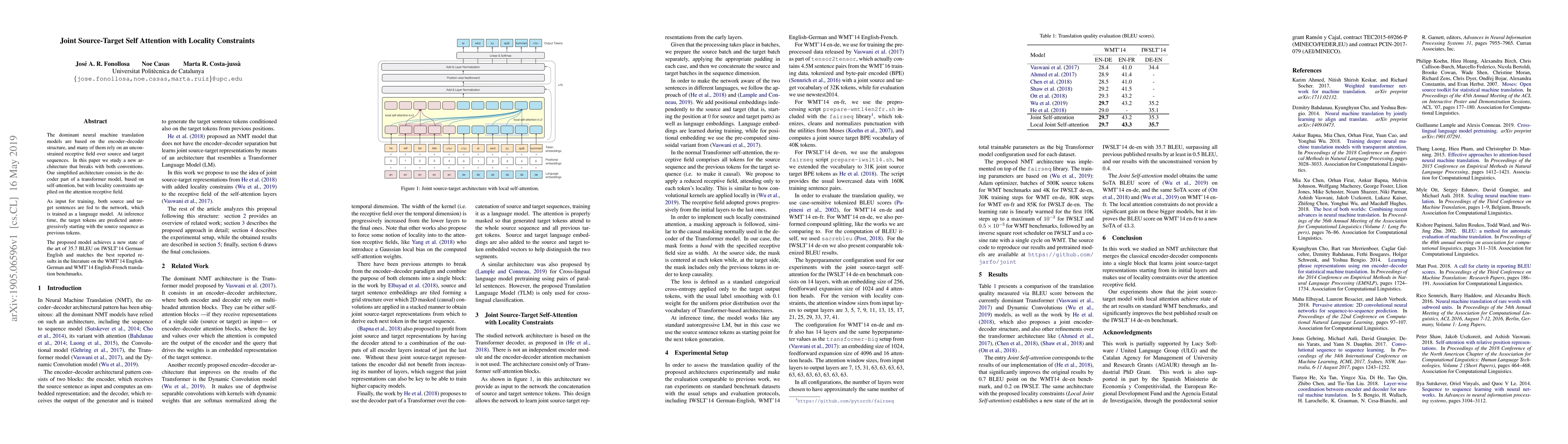 This paper introduces a novel transformer-based decoder architecture with locality constraints on the attention receptive field, achieving state-of-the-art results on multiple translation benchmarks, outperforming traditional encoder-decoder models. The model jointly trains on source and target sentences, predicting target tokens autoregressively from the source sequence.