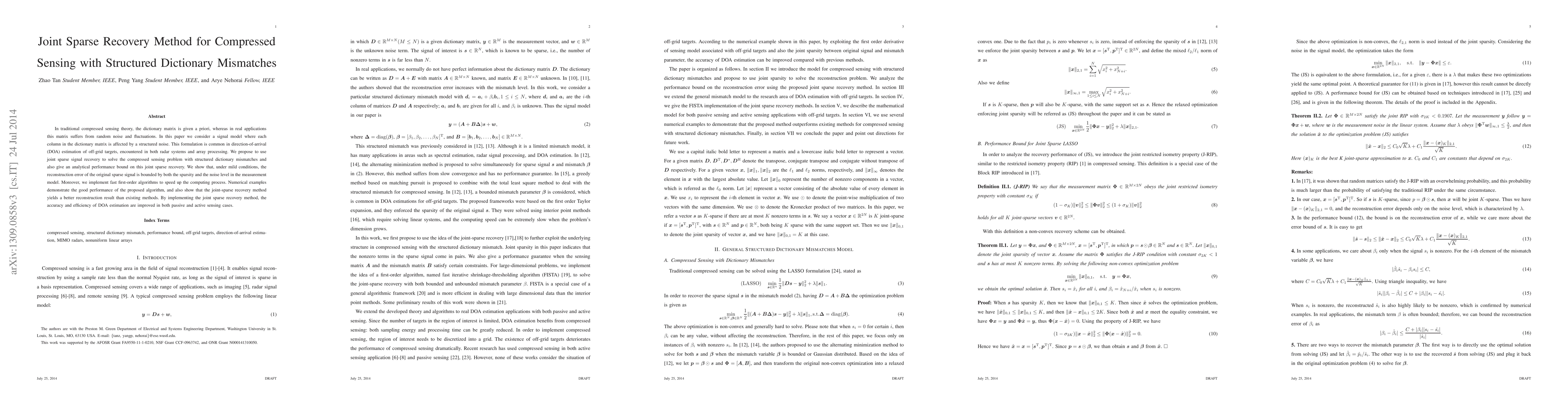 This paper proposes a joint sparse recovery method to address compressed sensing problems with structured dictionary mismatches, common in direction-of-arrival estimation. The method achieves better reconstruction accuracy and efficiency compared to existing techniques, as demonstrated through numerical examples and improved DOA estimation accuracy.
