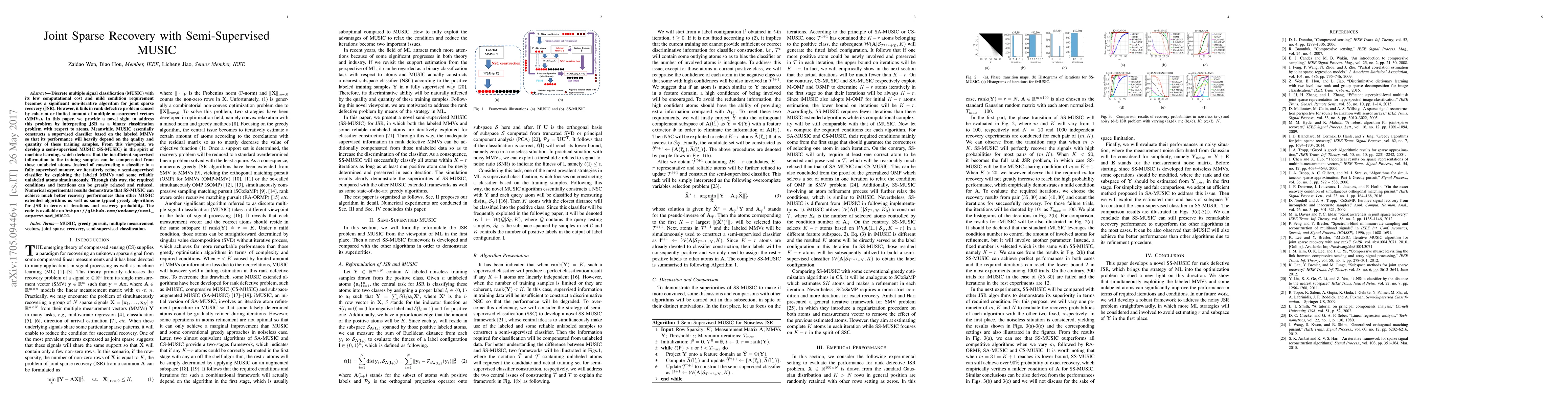 Discrete multiple signal classification (MUSIC) with its low computational cost and mild condition requirement becomes a significant noniterative algorithm for joint sparse recovery (JSR). However, it fails in rank defective problem caused by coherent or limited amount of multiple measurement vectors (MMVs). In this letter, we provide a novel sight to address this problem by interpreting JSR as a binary classification problem with respect to atoms. Meanwhile, MUSIC essentially constructs a supervised classifier based on the labeled MMVs so that its performance will heavily depend on the quality and quantity of these training samples. From this viewpoint, we develop a semisupervised MUSIC (SS-MUSIC) in the spirit of machine learning, which declares that the insufficient supervised information in the training samples can be compensated from those unlabeled atoms. Instead of constructing a classifier in a fully supervised manner, we iteratively refine a semisupervised classifier by exploiting the labeled MMVs and some reliable unlabeled atoms simultaneously. Through this way, the required conditions and iterations can be greatly relaxed and reduced. Numerical experimental results demonstrate that SS-MUSIC can achieve much better recovery performances than other MUSIC extended algorithms as well as some typical greedy algorithms for JSR in terms of iterations and recovery probability.