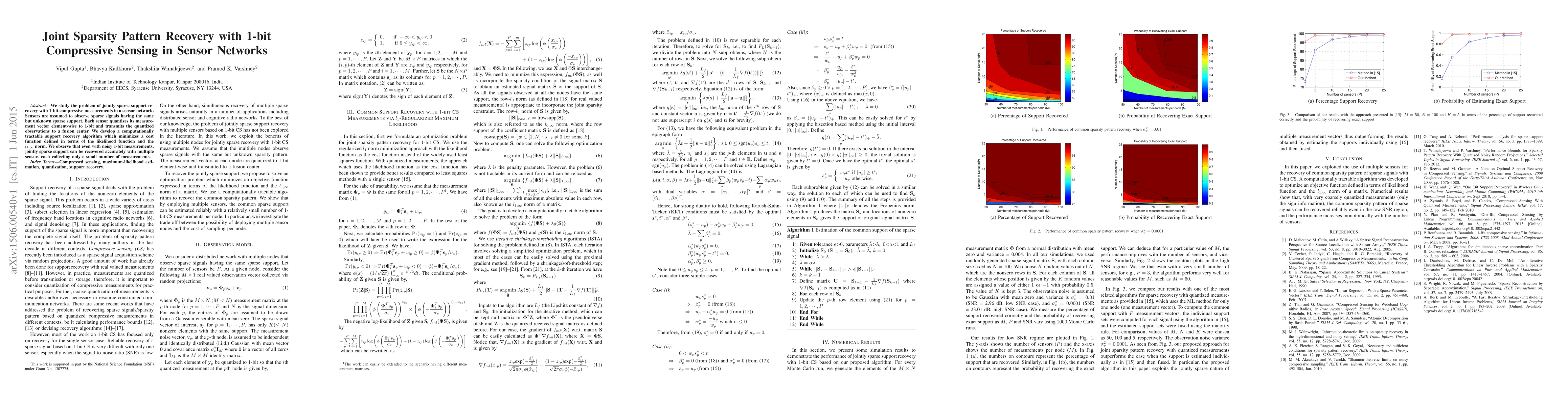 This paper explores joint sparse support recovery in sensor networks using 1-bit compressive sensing, where sensors collect sparse signals with the same unknown sparse support. It proposes a computationally efficient algorithm that minimizes a cost function combining likelihood and $l_{1,\infty}$ norm, demonstrating accurate recovery even with noisy 1-bit measurements from multiple sensors.
