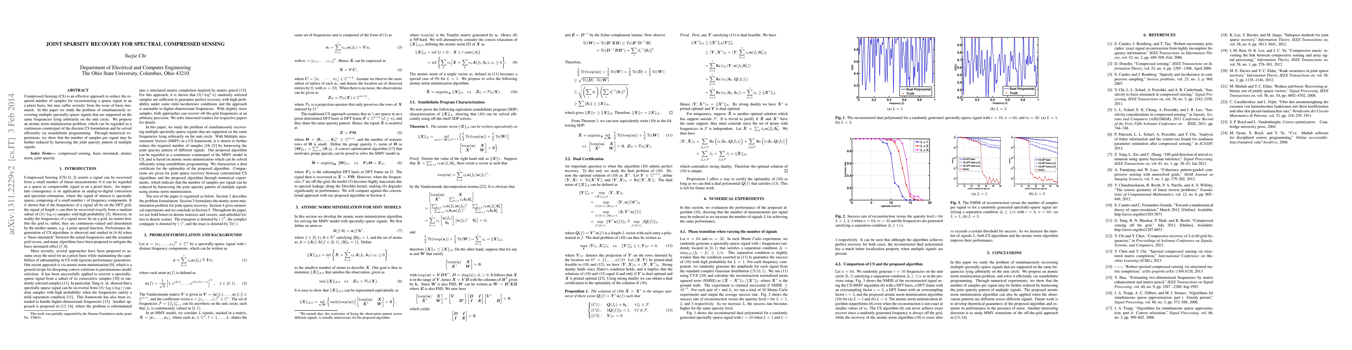 The paper proposes an atomic norm minimization problem for simultaneously recovering multiple spectrally-sparse signals supported on the same frequencies on the unit circle. This problem is solved efficiently via semidefinite programming.