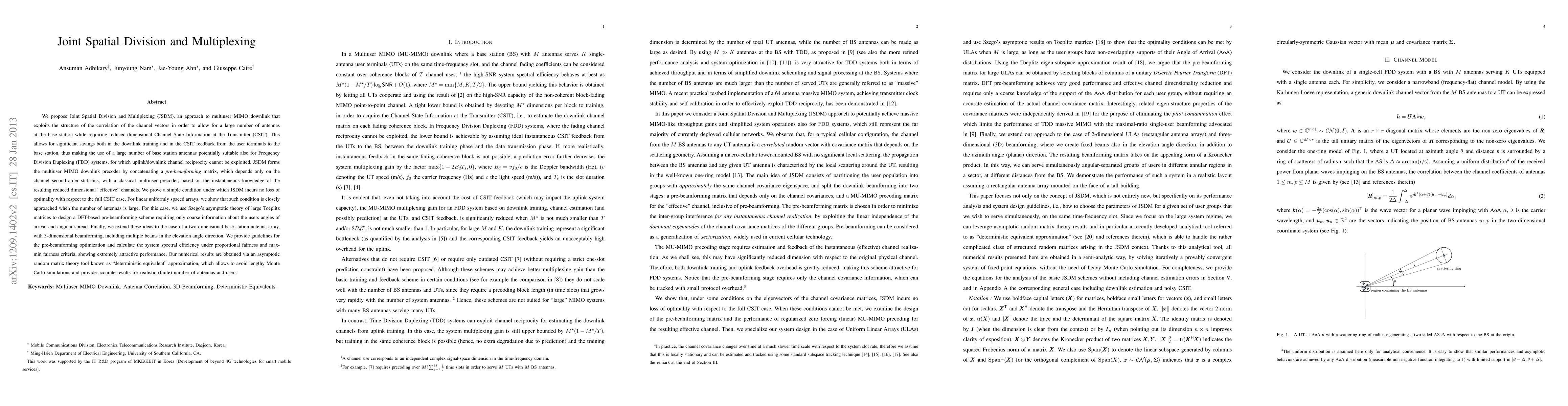 This paper proposes Joint Spatial Division and Multiplexing (JSDM) for multiuser MIMO downlink, which reduces the required Channel State Information at the Transmitter (CSIT) by exploiting channel correlation structure. JSDM combines a pre-beamforming matrix based on second-order statistics with a classical precoder, achieving optimal performance with reduced CSIT feedback, and is shown to work well for large antenna arrays and 3-dimensional beamforming.