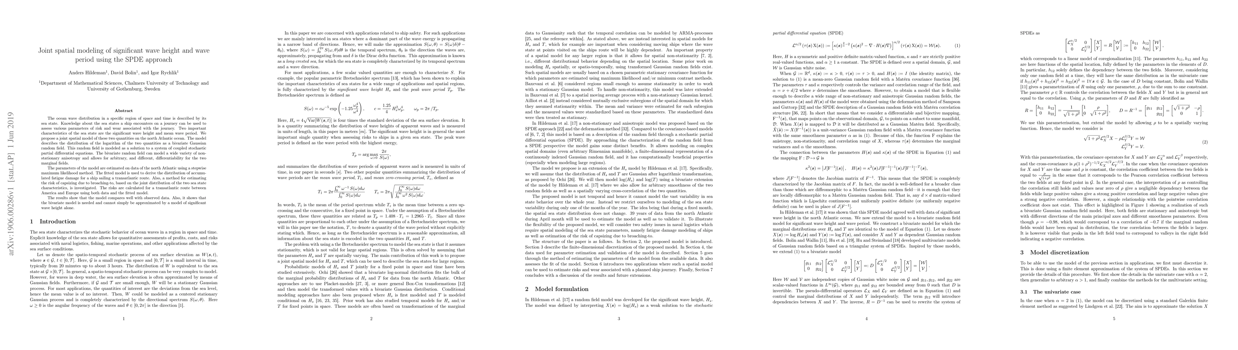 This paper proposes a joint spatial model for significant wave height and wave period in the North Atlantic using the SPDE approach, showing that a bivariate model is necessary for accurate risk assessment and fatigue damage prediction for ships on transatlantic routes. The model's parameters are estimated using maximum likelihood, and it compares well with observed data.