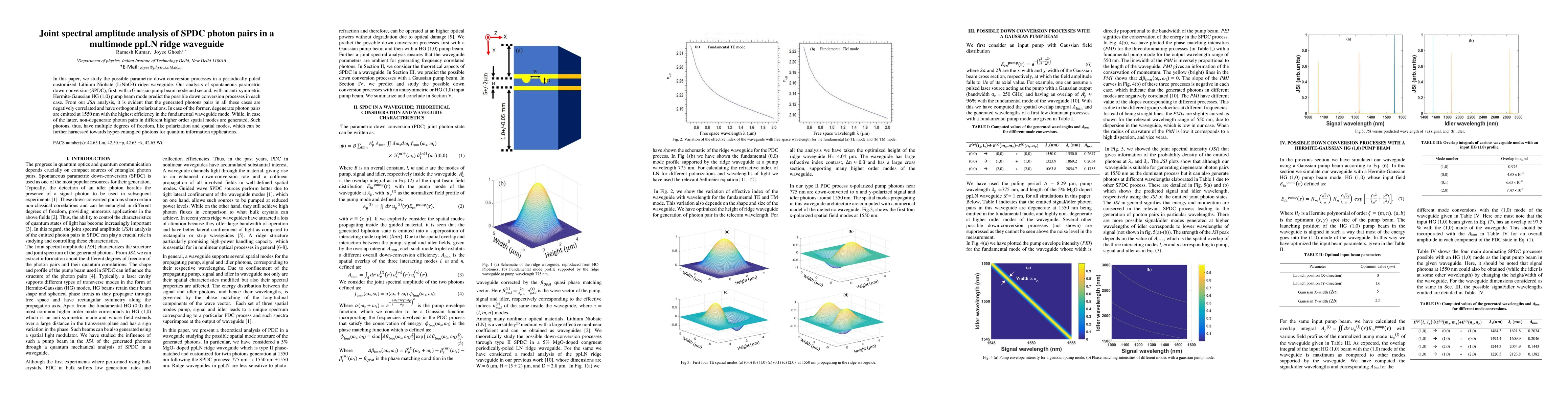 In this paper, we study the possible parametric down conversion processes in a periodically poled customized Lithium Niobate (LiNbO3) ridge waveguide. Our analysis of spontaneous parametric down-conversion (SPDC), first, with a Gaussian pump beam mode and second, with an anti-symmetric Hermite-Gaussian HG (1,0) pump beam mode predict the possible down conversion processes in each case. From our JSA analysis, it is evident that the generated photons pairs in all these cases are negatively correlated and have orthogonal polarizations. In case of the former, degenerate photon pairs are emitted at 1550 nm with the highest efficiency in the fundamental waveguide mode. While, in case of the latter, non-degenerate photon pairs in different higher order spatial modes are generated. Such photons, thus, have multiple degrees of freedom, like polarization and spatial modes, which can be further harnessed towards hyper-entangled photons for quantum information applications.
