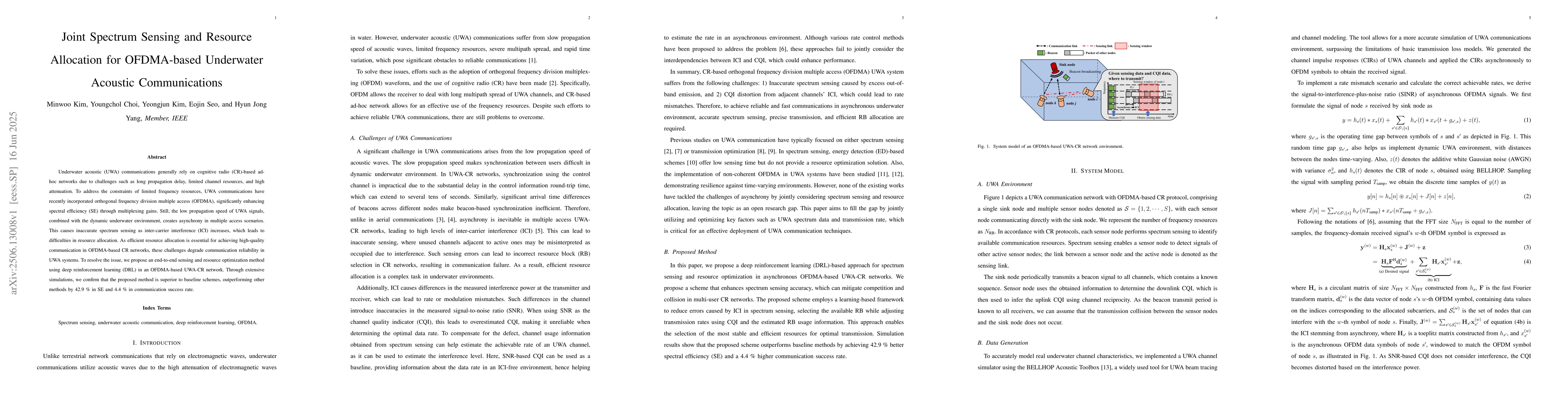 Underwater acoustic (UWA) communications generally rely on cognitive radio (CR)-based ad-hoc networks due to challenges such as long propagation delay, limited channel resources, and high attenuation. To address the constraints of limited frequency resources, UWA communications have recently incorporated orthogonal frequency division multiple access (OFDMA), significantly enhancing spectral efficiency (SE) through multiplexing gains. Still, {the} low propagation speed of UWA signals, combined with {the} dynamic underwater environment, creates asynchrony in multiple access scenarios. This causes inaccurate spectrum sensing as inter-carrier interference (ICI) increases, which leads to difficulties in resource allocation. As efficient resource allocation is essential for achieving high-quality communication in OFDMA-based CR networks, these challenges degrade communication reliability in UWA systems. To resolve the issue, we propose an end-to-end sensing and resource optimization method using deep reinforcement learning (DRL) in an OFDMA-based UWA-CR network. Through extensive simulations, we confirm that the proposed method is superior to baseline schemes, outperforming other methods by 42.9 % in SE and 4.4 % in communication success rate.