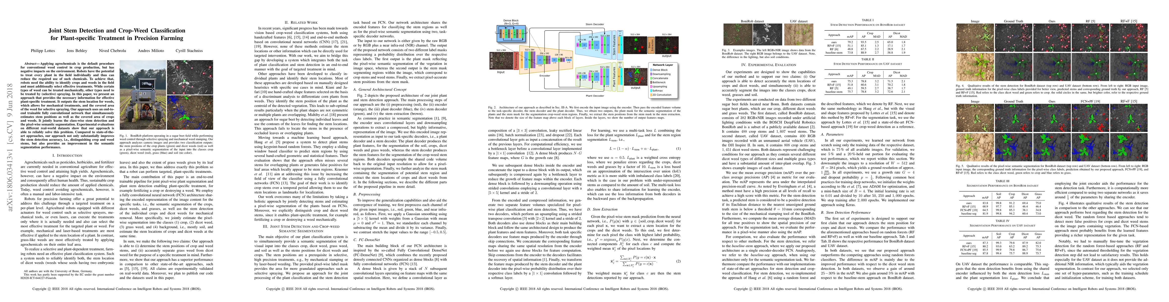 This paper proposes a method for joint stem detection and crop-weed classification using a fully convolutional network to enable precision farming robots to apply targeted treatments, reducing agrochemical use. The approach improves both stem detection accuracy and semantic segmentation performance compared to existing methods.