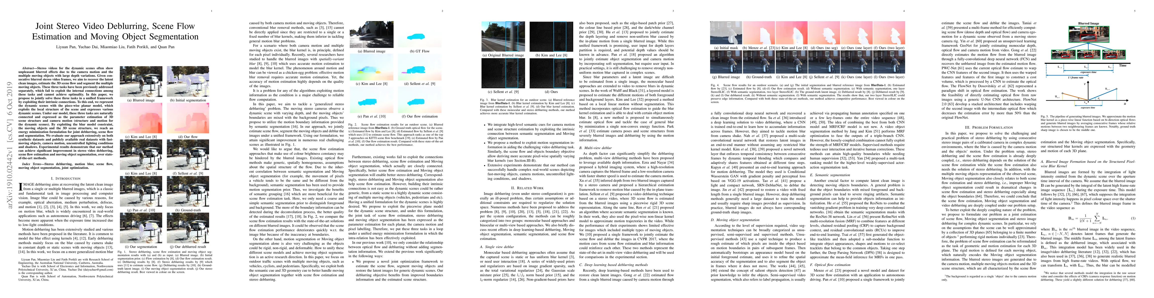 This paper proposes a unified framework to jointly solve stereo video deblurring, scene flow estimation, and moving object segmentation by exploiting their intrinsic connections. The approach uses a piece-wise planar model to represent dynamic scenes and achieves significant improvements over state-of-the-art methods through an energy minimization formulation.