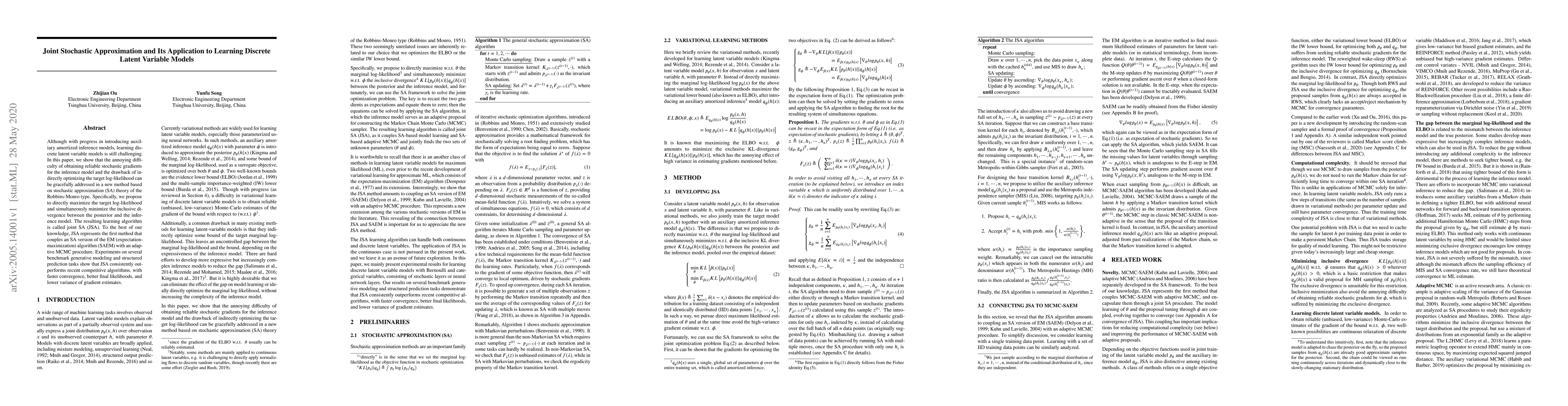 Although with progress in introducing auxiliary amortized inference models, learning discrete latent variable models is still challenging. In this paper, we show that the annoying difficulty of obtaining reliable stochastic gradients for the inference model and the drawback of indirectly optimizing the target log-likelihood can be gracefully addressed in a new method based on stochastic approximation (SA) theory of the Robbins-Monro type. Specifically, we propose to directly maximize the target log-likelihood and simultaneously minimize the inclusive divergence between the posterior and the inference model. The resulting learning algorithm is called joint SA (JSA). To the best of our knowledge, JSA represents the first method that couples an SA version of the EM (expectation-maximization) algorithm (SAEM) with an adaptive MCMC procedure. Experiments on several benchmark generative modeling and structured prediction tasks show that JSA consistently outperforms recent competitive algorithms, with faster convergence, better final likelihoods, and lower variance of gradient estimates.