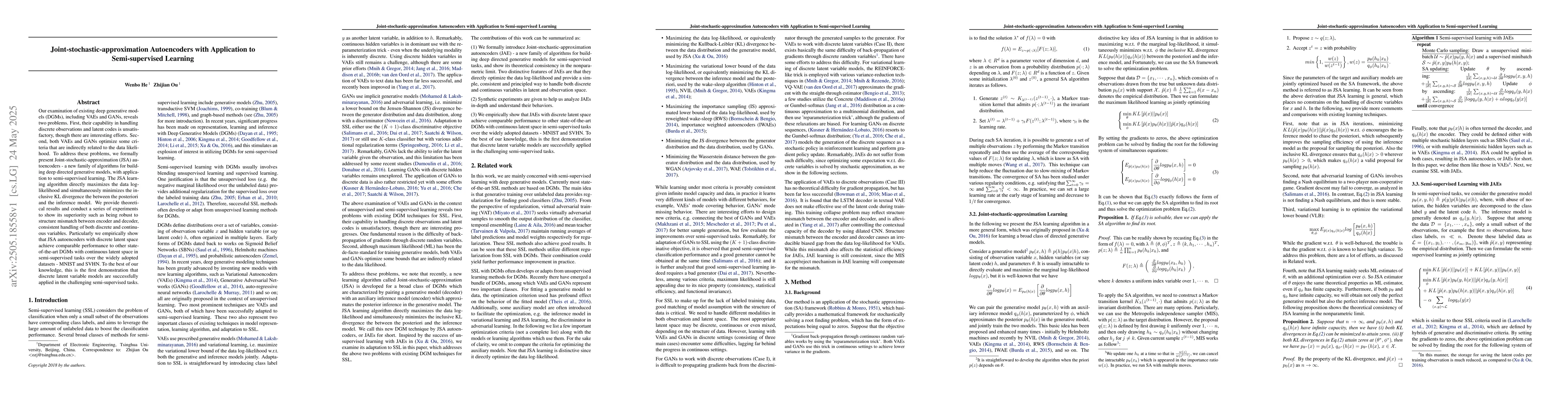 Our examination of existing deep generative models (DGMs), including VAEs and GANs, reveals two problems. First, their capability in handling discrete observations and latent codes is unsatisfactory, though there are interesting efforts. Second, both VAEs and GANs optimize some criteria that are indirectly related to the data likelihood. To address these problems, we formally present Joint-stochastic-approximation (JSA) autoencoders - a new family of algorithms for building deep directed generative models, with application to semi-supervised learning. The JSA learning algorithm directly maximizes the data log-likelihood and simultaneously minimizes the inclusive KL divergence the between the posteriori and the inference model. We provide theoretical results and conduct a series of experiments to show its superiority such as being robust to structure mismatch between encoder and decoder, consistent handling of both discrete and continuous variables. Particularly we empirically show that JSA autoencoders with discrete latent space achieve comparable performance to other state-of-the-art DGMs with continuous latent space in semi-supervised tasks over the widely adopted datasets - MNIST and SVHN. To the best of our knowledge, this is the first demonstration that discrete latent variable models are successfully applied in the challenging semi-supervised tasks.