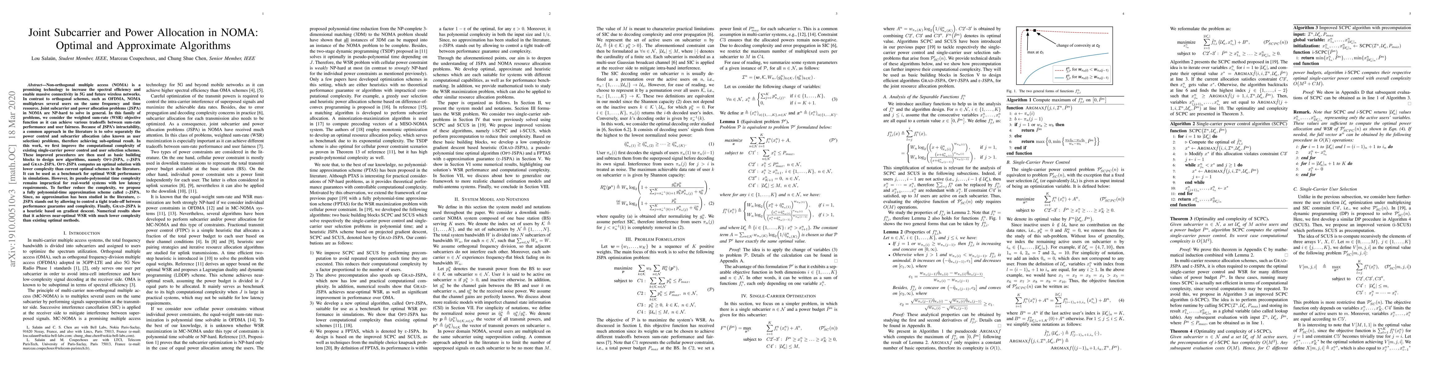 This paper proposes optimal and approximate algorithms for joint subcarrier and power allocation in NOMA to enhance spectral efficiency and connectivity in 5G networks. It introduces Opt-JSPA for optimal solutions with lower complexity, $\varepsilon$-JSPA for a trade-off between performance and complexity, and Grad-JSPA for near-optimal results with lower computational demands.
