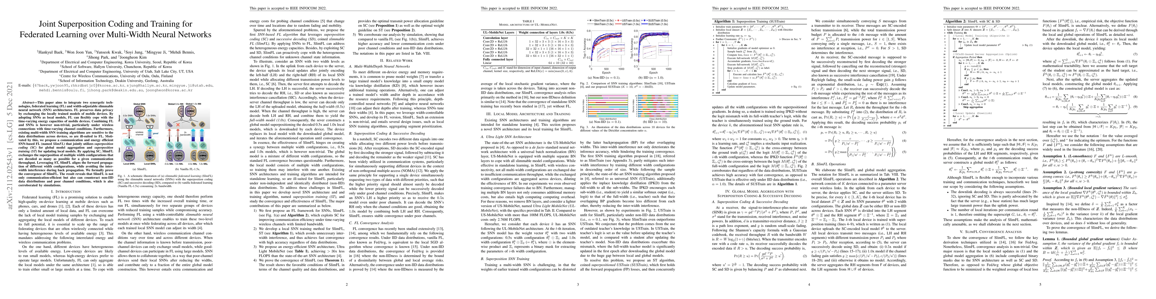 Researchers propose a communication-efficient federated learning method called SlimFL that uses superposition coding for global model aggregation and superposition training to update local models, overcoming challenges of multi-width neural networks and poor channel conditions.