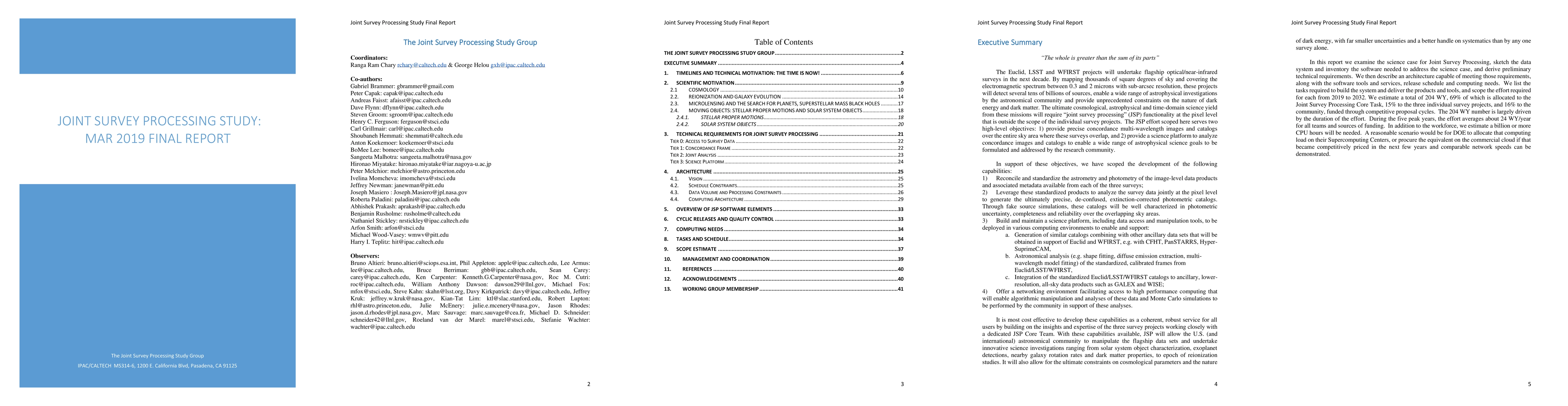 This report details the joint survey processing (JSP) initiative for the Euclid, Rubin/LSST, and Roman (WFIRST) projects, aimed at creating precise multi-wavelength images and catalogs over overlapping survey areas. JSP will enable a wide range of astrophysical investigations and provide improved constraints on dark energy and dark matter.