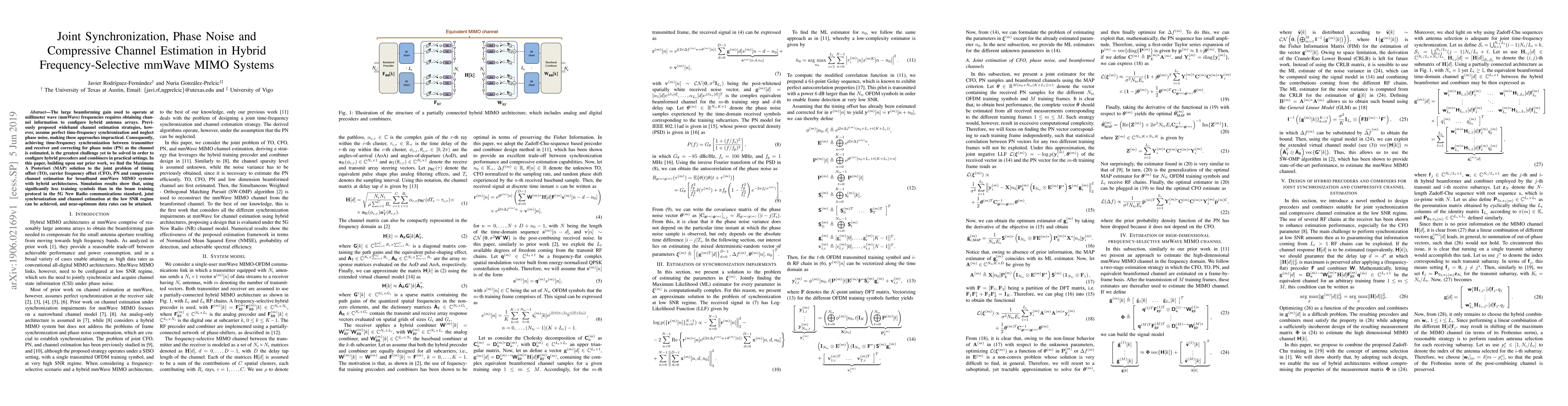 A joint solution to TO, CFO, PN, and compressive channel estimation for frequency-selective mmWave MIMO systems using a frame-wise estimation framework.