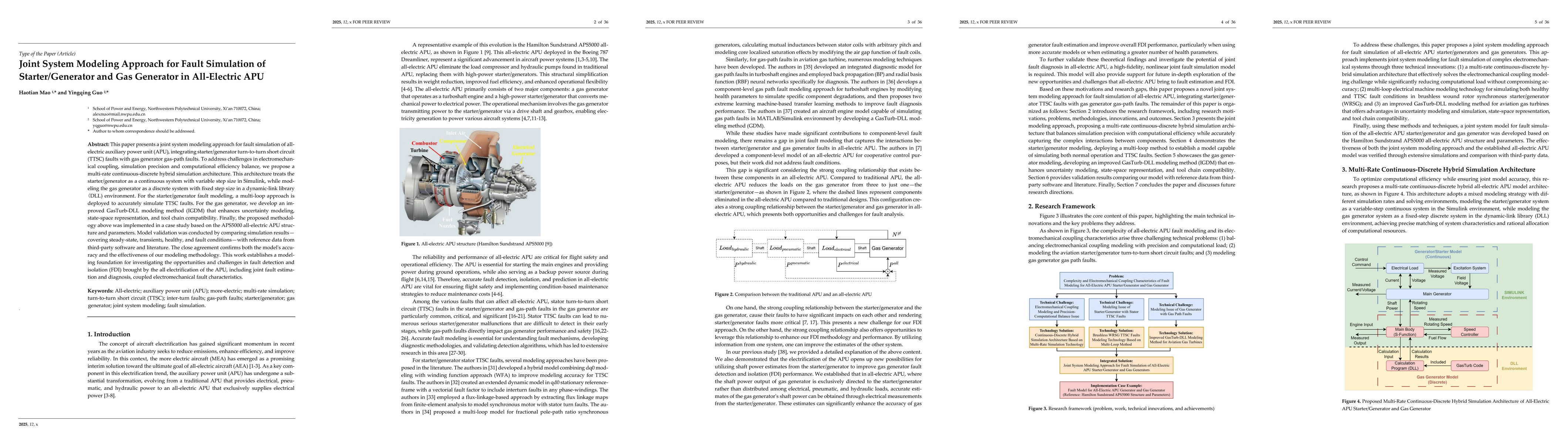 This paper presents a joint system modeling approach for fault simulation of all-electric auxiliary power unit (APU), integrating starter/generator turn-to-turn short circuit (TTSC) faults with gas generator gas-path faults.To address challenges in electromechanical coupling, simulation precision and computational efficiency balance, we propose a multi-rate continuous-discrete hybrid simulation architecture. This architecture treats the starter/generator as a continuous system with variable step size in Simulink, while modeling the gas generator as a discrete system with fixed step size in a dynamic-link library (DLL) environment. For the starter/generator fault modeling, a multi-loop approach is deployed to accurately simulate TTSC faults. For the gas generator, we develop an improved GasTurb-DLL modeling method (IGDM) that enhances uncertainty modeling, state-space representation, and tool chain compatibility. Finally, the proposed methodology above was implemented in a case study based on the APS5000 all-electric APU structure and parameters. Model validation was conducted by comparing simulation results--covering steady-state, transients, healthy, and fault conditions--with reference data from third-party software and literature. The close agreement confirms both the model's accuracy and the effectiveness of our modeling methodology. This work establishes a modeling foundation for investigating the opportunities and challenges in fault detection and isolation (FDI) brought by the all electrification of the APU, including joint fault estimation and diagnosis, coupled electromechanical fault characteristics.
