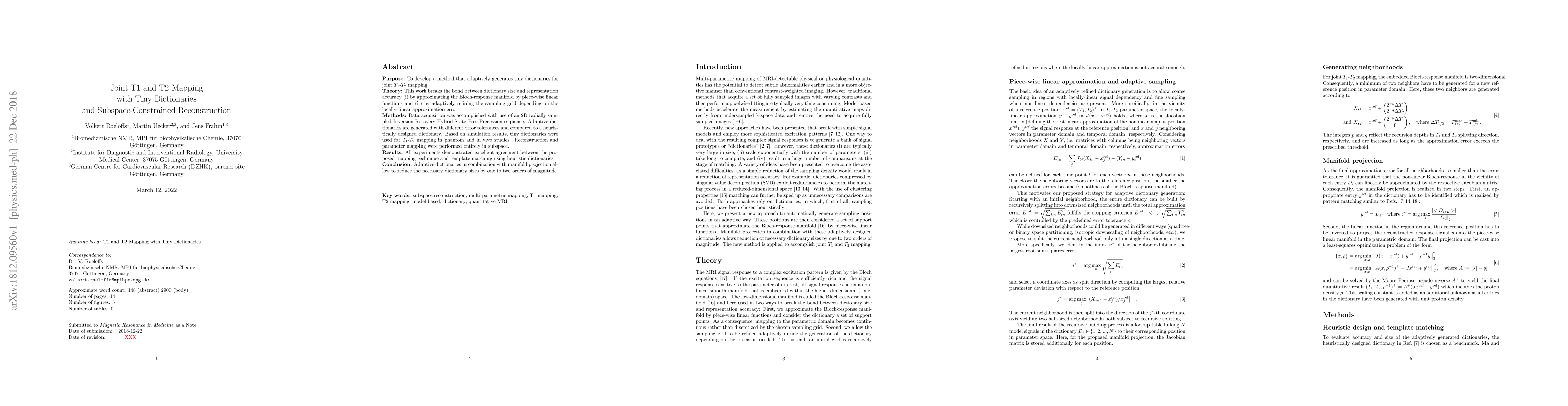 The research develops a method for joint T1-T2 mapping using adaptive dictionaries and subspace-constrained reconstruction. It approximates the Bloch-response manifold with piece-wise linear functions and adaptively refines the sampling grid based on local linear approximation error. The method was validated using a home-brew phantom and in vivo studies with a 2D radially sampled Inversion-Recovery Hybrid-State Free Precession sequence.
