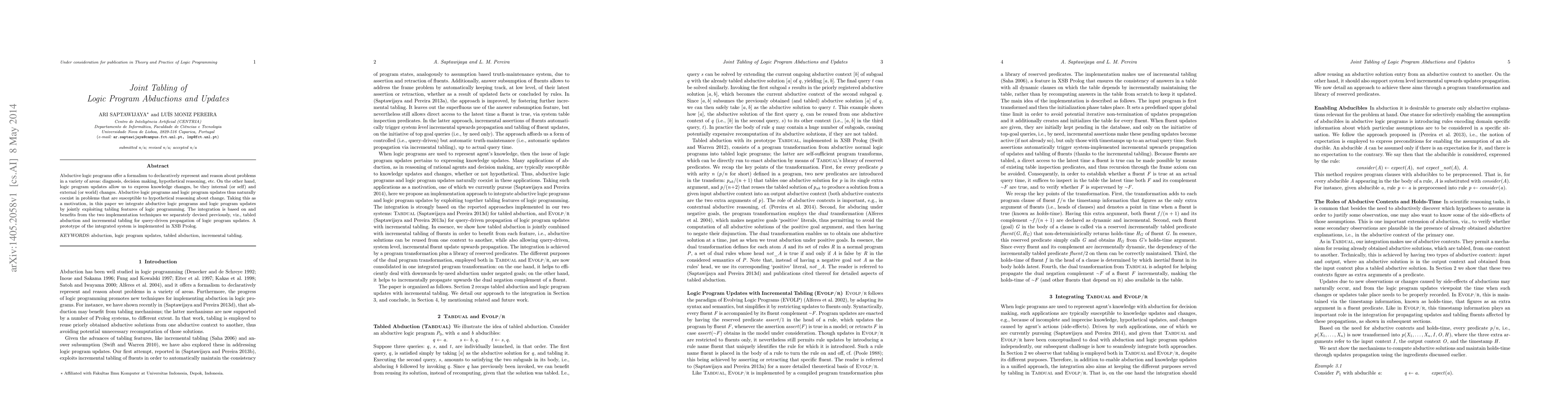 The paper presents a novel program transformation and a library of reserved predicates for joint tabling of abductions and updates in logic programming.