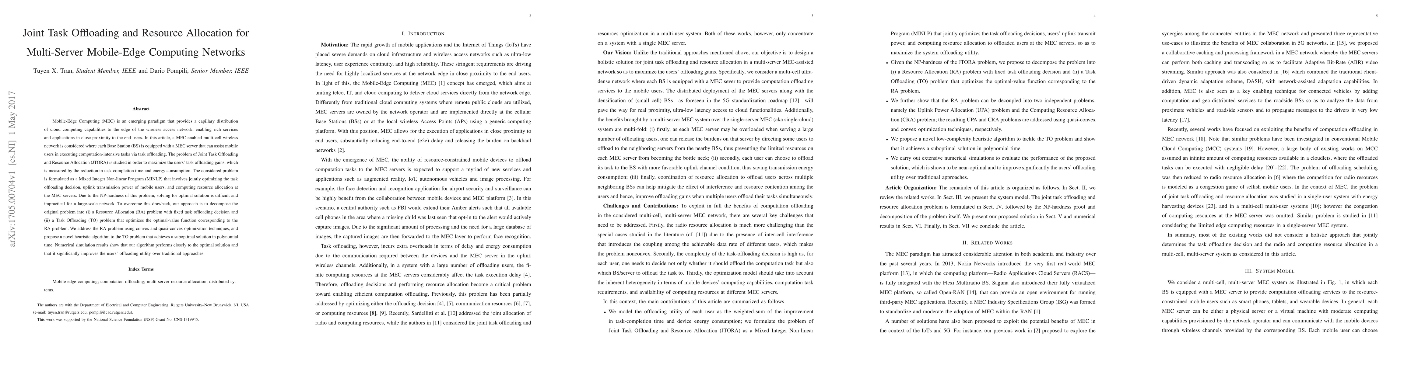 This paper studies the Joint Task Offloading and Resource Allocation (JTORA) problem in multi-server Mobile-Edge Computing (MEC) networks. It formulates the problem as a Mixed Integer Non-linear Program (MINLP) and proposes a decomposition approach to address it, utilizing convex optimization for resource allocation and a heuristic algorithm for task offloading. Simulation results indicate the proposed method significantly enhances offloading utility while remaining close to the optimal solution.