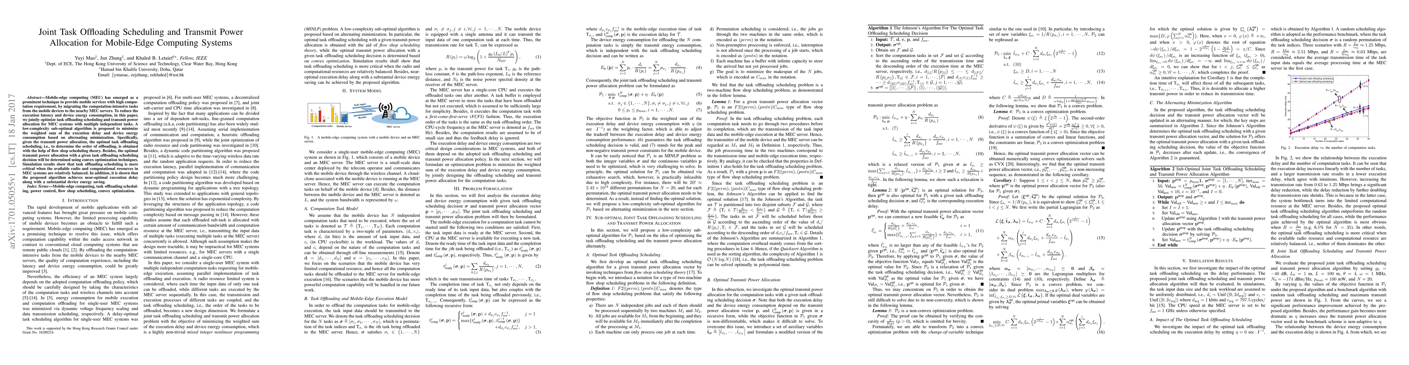 This paper proposes a joint optimization algorithm for task offloading scheduling and transmit power allocation in mobile-edge computing systems to minimize execution latency and device energy consumption. The algorithm leverages alternating minimization, flow shop scheduling theory, and convex optimization to achieve near-optimal performance.