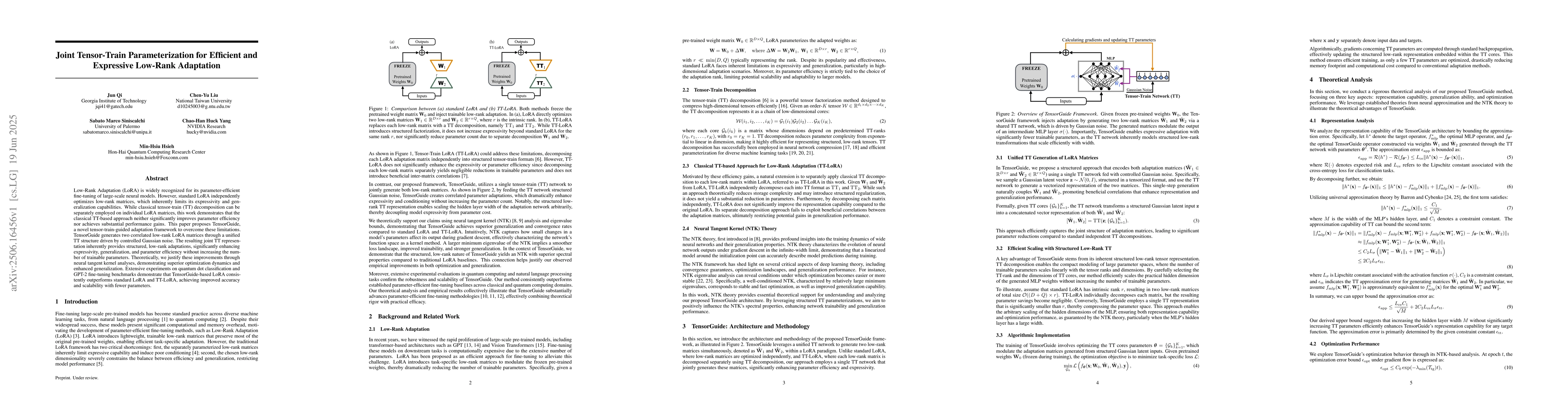 Low-Rank Adaptation (LoRA) is widely recognized for its parameter-efficient fine-tuning of large-scale neural models. However, standard LoRA independently optimizes low-rank matrices, which inherently limits its expressivity and generalization capabilities. While classical tensor-train (TT) decomposition can be separately employed on individual LoRA matrices, this work demonstrates that the classical TT-based approach neither significantly improves parameter efficiency nor achieves substantial performance gains. This paper proposes TensorGuide, a novel tensor-train-guided adaptation framework to overcome these limitations. TensorGuide generates two correlated low-rank LoRA matrices through a unified TT structure driven by controlled Gaussian noise. The resulting joint TT representation inherently provides structured, low-rank adaptations, significantly enhancing expressivity, generalization, and parameter efficiency without increasing the number of trainable parameters. Theoretically, we justify these improvements through neural tangent kernel analyses, demonstrating superior optimization dynamics and enhanced generalization. Extensive experiments on quantum dot classification and GPT-2 fine-tuning benchmarks demonstrate that TensorGuide-based LoRA consistently outperforms standard LoRA and TT-LoRA, achieving improved accuracy and scalability with fewer parameters.