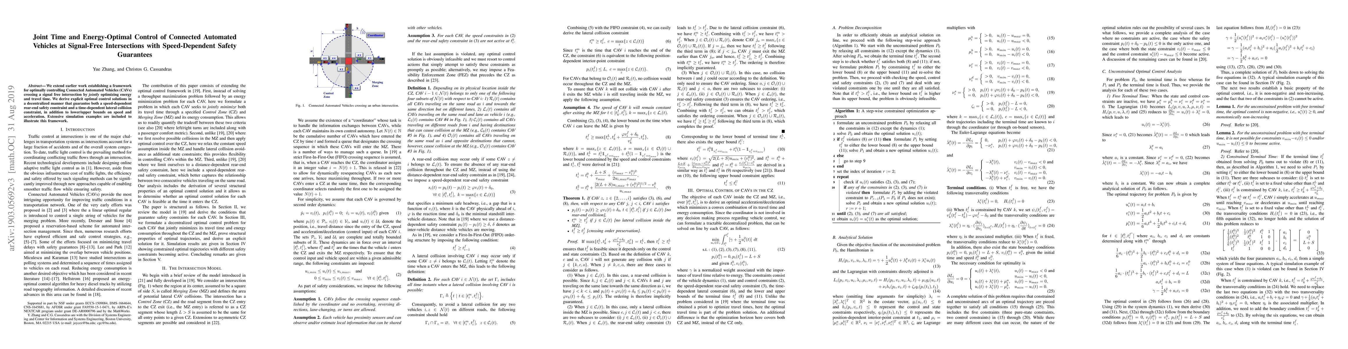 We extend earlier work establishing a framework for optimally controlling Connected Automated Vehicles (CAVs) crossing a signal free intersection by jointly optimizing energy and travel time. We derive explicit optimal control solutions in a decentralized manner that guarantee both a speed-dependent rear-end safety constraint and a time-dependent lateral collision constraint, in addition to lower/upper bounds on speed and acceleration. Extensive simulation examples are included to illustrate this framework.
