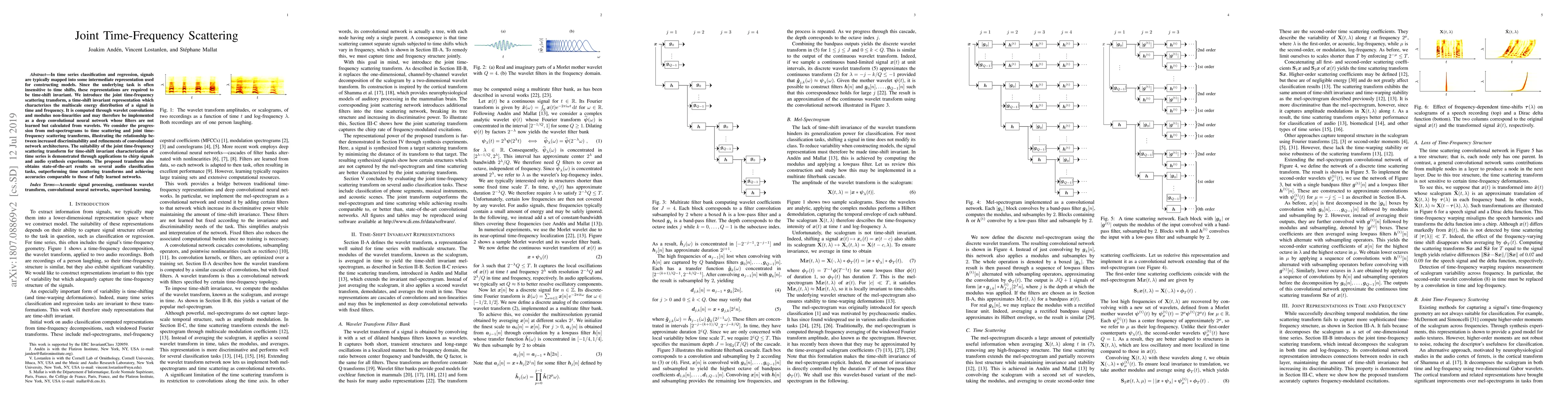The paper introduces the joint time-frequency scattering transform for time-shift invariant time series classification, utilizing wavelet convolutions for multiscale energy distribution. It outperforms existing methods and achieves state-of-the-art results in audio classification tasks.