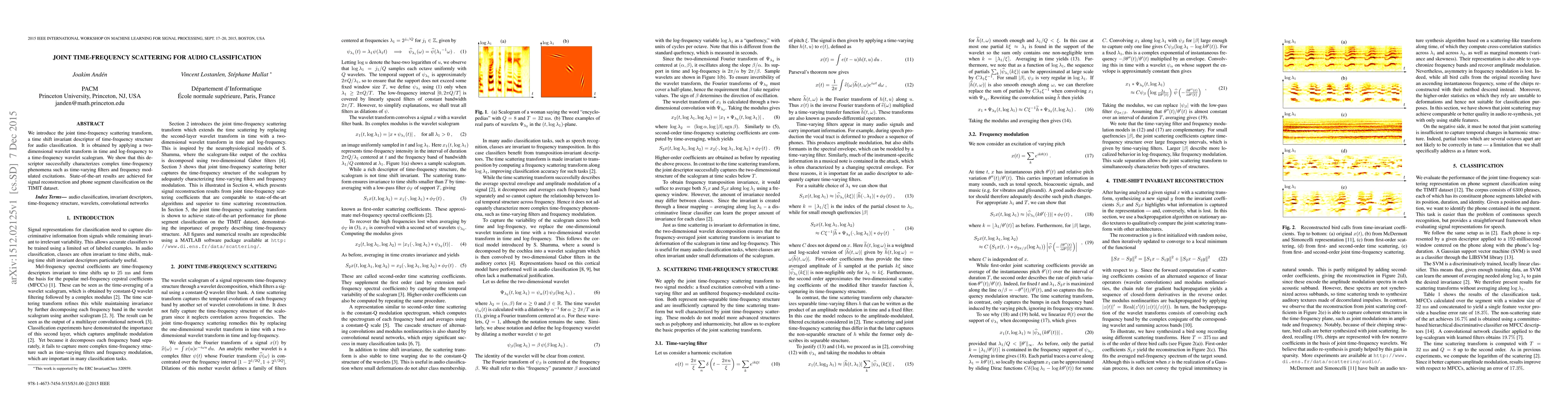 The joint time-frequency scattering transform is a time shift invariant descriptor for audio classification, achieved through a two-dimensional wavelet transform. It characterizes complex audio phenomena and achieves state-of-the-art results in signal reconstruction and phone segment classification.
