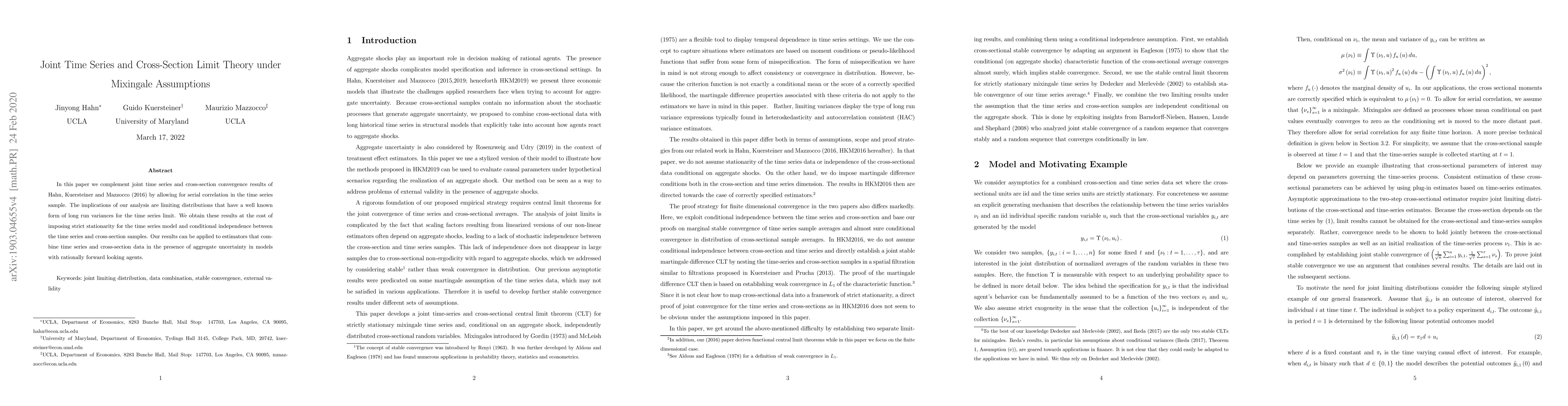 This paper develops a joint time series and cross-section limit theory under mixingale assumptions, allowing for serial correlation in time series samples while imposing strict stationarity and conditional independence. The results provide limiting distributions with well-known long-run variances for time series limits.