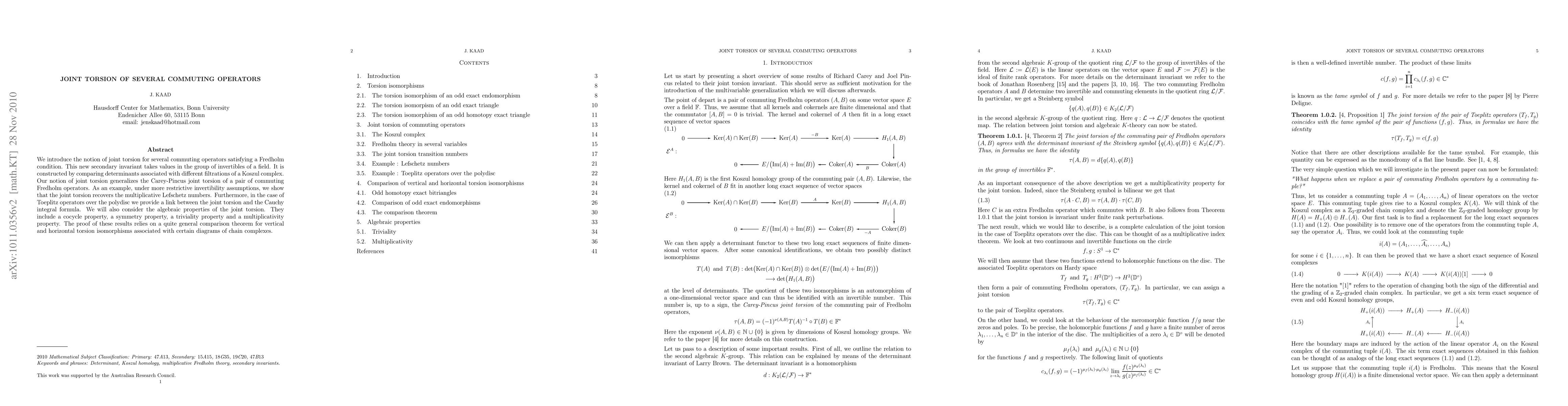 We introduce the notion of joint torsion for several commuting operators satisfying a Fredholm condition. This new secondary invariant takes values in the group of invertibles of a field. It is constructed by comparing determinants associated with different filtrations of a Koszul complex. Our notion of joint torsion generalizes the Carey-Pincus joint torsion of a pair of commuting Fredholm operators. As an example, under more restrictive invertibility assumptions, we show that the joint torsion recovers the multiplicative Lefschetz numbers. Furthermore, in the case of Toeplitz operators over the polydisc we provide a link between the joint torsion and the Cauchy integral formula. We will also consider the algebraic properties of the joint torsion. They include a cocycle property, a symmetry property, a triviality property and a multiplicativity property. The proof of these results relies on a quite general comparison theorem for vertical and horizontal torsion isomorphisms associated with certain diagrams of chain complexes.