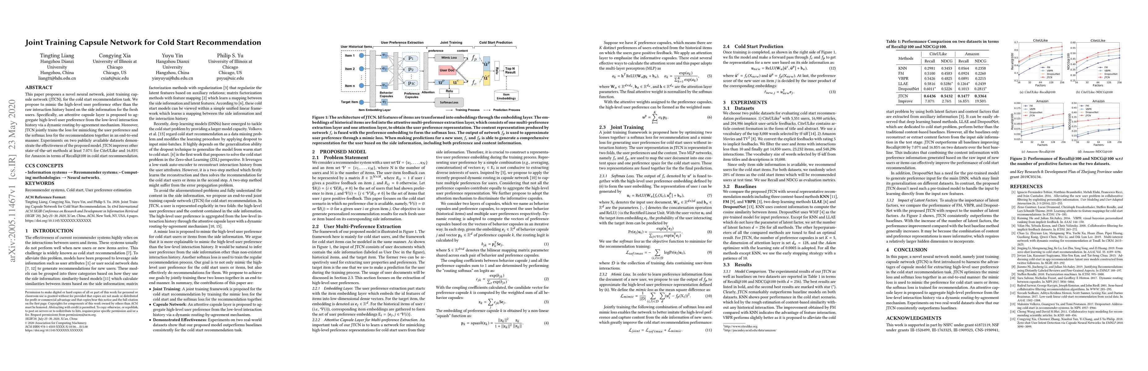 This paper introduces a joint training capsule network (JTCN) to tackle cold start recommendation by mimicking high-level user preferences using side information. JTCN integrates an attentive capsule layer and dynamic routing for improved performance, achieving significant improvements over state-of-the-art methods on two datasets.