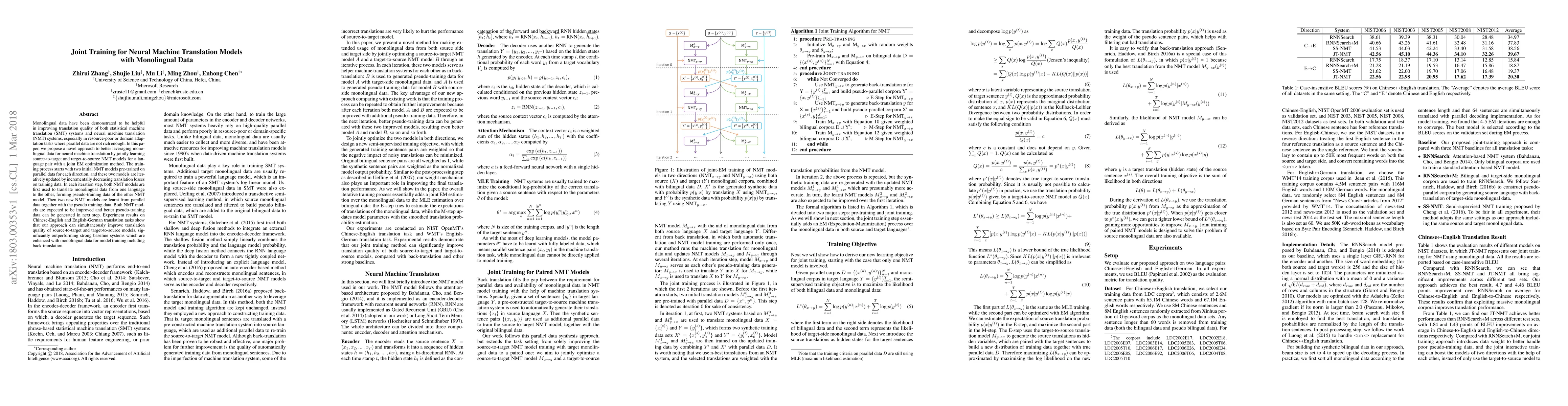 This paper proposes a joint training method for neural machine translation (NMT) models using monolingual data, which iteratively updates source-to-target and target-to-source NMT models through a joint EM optimization, showing significant improvements over baseline systems in Chinese-English and English-German translation tasks.