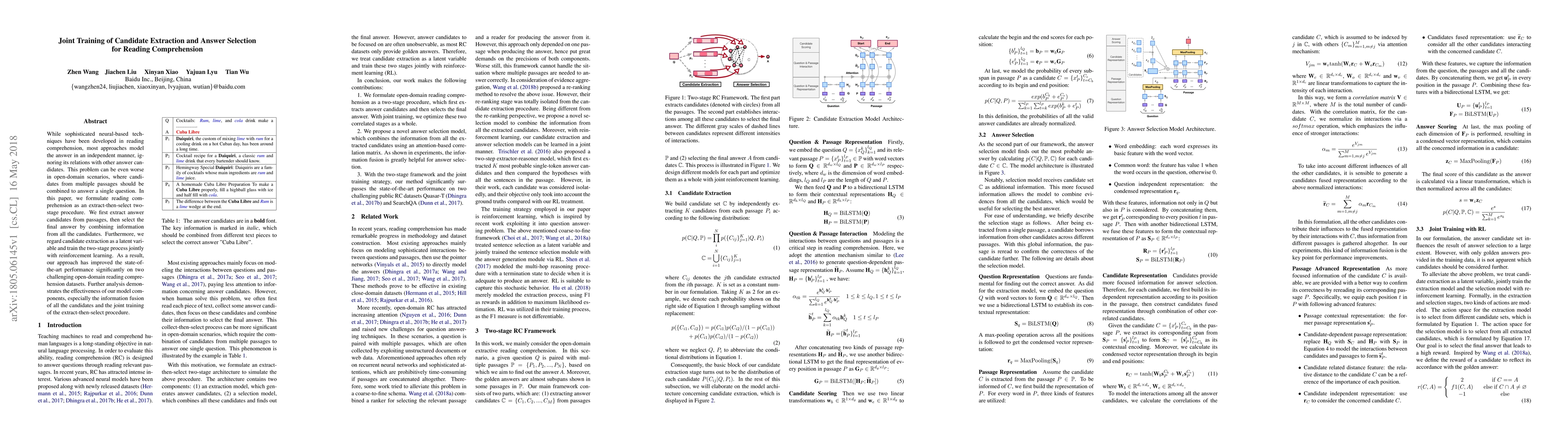 This paper proposes a joint training method for candidate extraction and answer selection in reading comprehension, improving performance on open-domain datasets. It combines information from all extracted candidates and trains the extract-then-select process jointly using reinforcement learning, achieving state-of-the-art results.