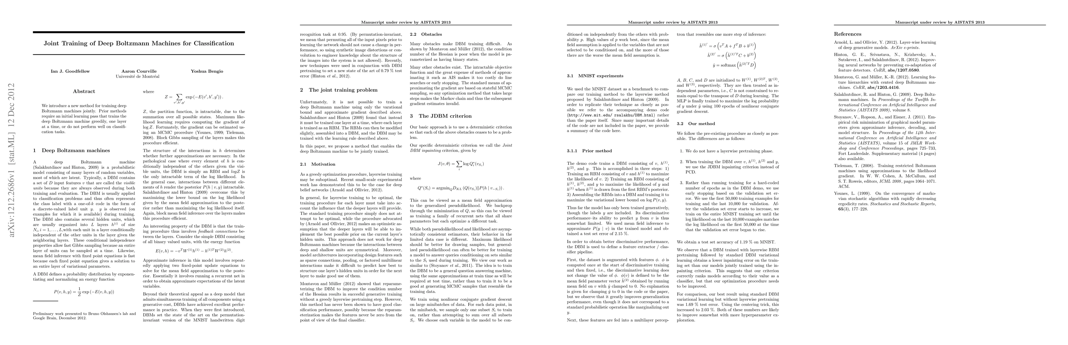 Summary: This paper proposes a novel joint training method for deep Boltzmann machines, which aims to improve performance over traditional greedy layer-wise training, particularly for classification tasks. The new approach trains all layers simultaneously, potentially enhancing overall efficiency and effectiveness.