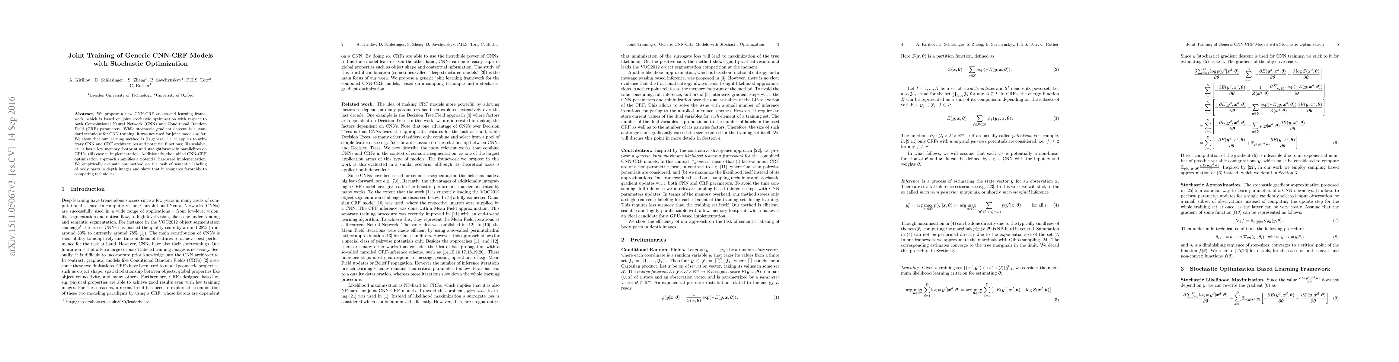 This research introduces a new end-to-end learning framework combining Convolutional Neural Networks (CNN) and Conditional Random Fields (CRF) through joint stochastic optimization. The proposed method is versatile, scalable, and easy to implement, demonstrating competitive performance in semantic labeling tasks. For more details, refer directly to the original paper.