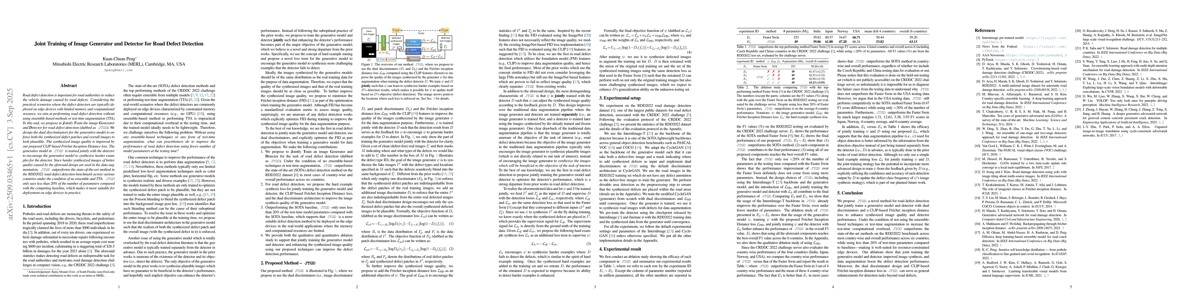 Road defect detection is important for road authorities to reduce the vehicle damage caused by road defects. Considering the practical scenarios where the defect detectors are typically deployed on edge devices with limited memory and computational resource, we aim at performing road defect detection without using ensemble-based methods or test-time augmentation (TTA). To this end, we propose to Jointly Train the image Generator and Detector for road defect detection (dubbed as JTGD). We design the dual discriminators for the generative model to enforce both the synthesized defect patches and overall images to look plausible. The synthesized image quality is improved by our proposed CLIP-based Fr\'echet Inception Distance loss. The generative model in JTGD is trained jointly with the detector to encourage the generative model to synthesize harder examples for the detector. Since harder synthesized images of better quality caused by the aforesaid design are used in the data augmentation, JTGD outperforms the state-of-the-art method in the RDD2022 road defect detection benchmark across various countries under the condition of no ensemble and TTA. JTGD only uses less than 20% of the number of parameters compared with the competing baseline, which makes it more suitable for deployment on edge devices in practice.