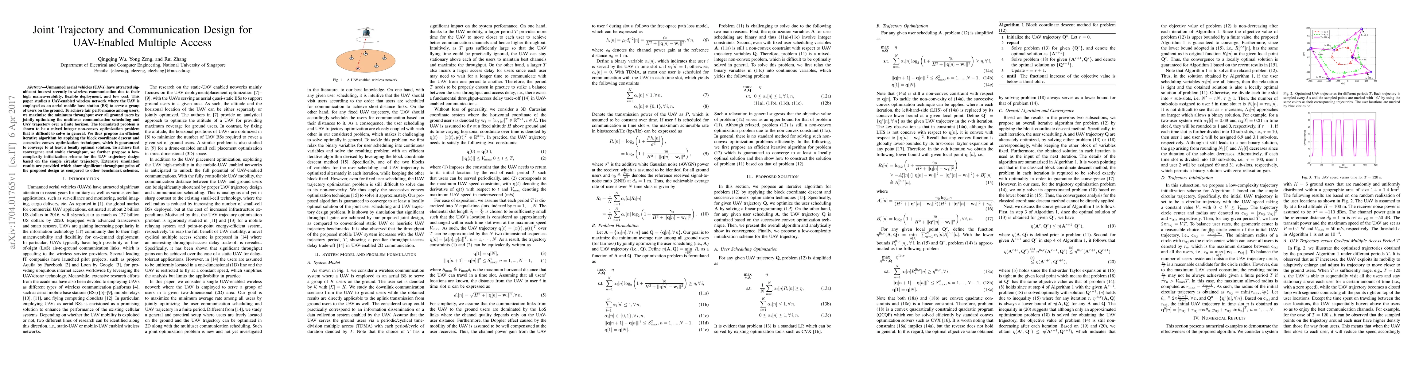 This paper proposes an iterative algorithm for optimizing UAV trajectory and communication scheduling in a multi-user network to maximize minimum throughput. The algorithm leverages block coordinate descent and successive convex optimization, achieving fast convergence and stable performance.