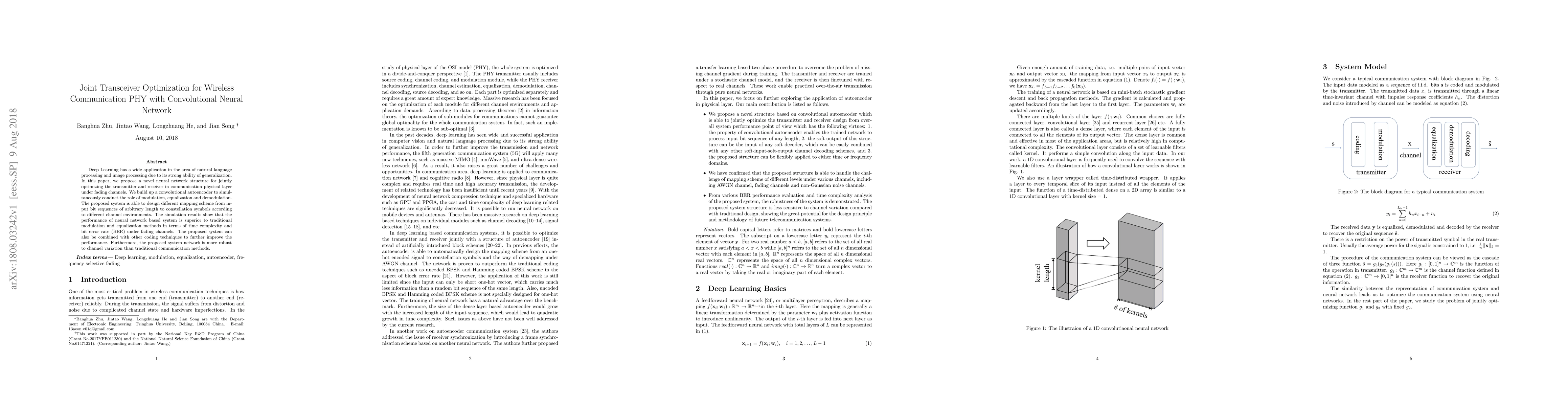 This paper proposes a convolutional autoencoder for joint transceiver optimization in wireless communication, achieving better performance than traditional methods in terms of time complexity and bit error rate under fading channels. The system is robust to channel variations and can be enhanced with additional coding techniques.