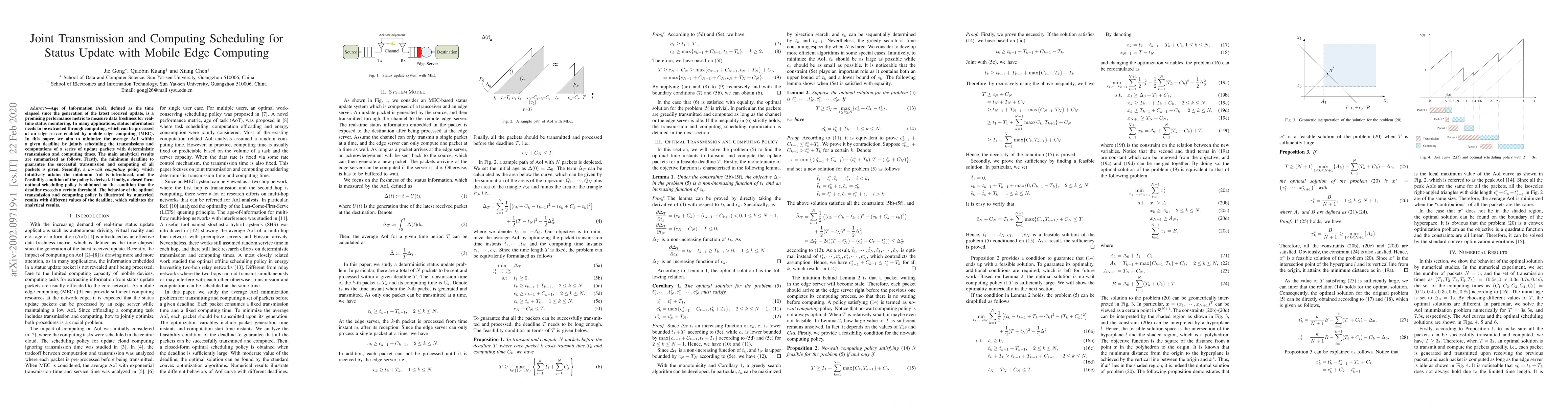 This paper proposes a joint transmission and computing scheduling strategy for minimizing the Age of Information (AoI) in real-time status monitoring using Mobile Edge Computing (MEC). It introduces a "no-wait computing" policy and provides analytical results for the minimum deadline to ensure successful processing, along with a closed-form optimal scheduling policy under certain conditions.