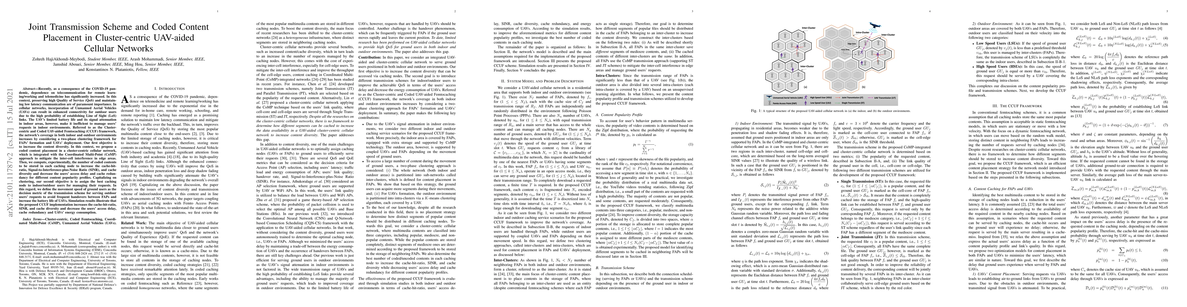 Recently, as a consequence of the COVID-19 pandemic, dependence on telecommunication for remote working and telemedicine has significantly increased. In cellular networks, incorporation of Unmanned Aerial Vehicles (UAVs) can result in enhanced connectivity for outdoor users due to the high probability of establishing Line of Sight (LoS) links. The UAV's limited battery life and its signal attenuation in indoor areas, however, make it inefficient to manage users' requests in indoor environments. Referred to as the Cluster centric and Coded UAV-aided Femtocaching (CCUF) framework, the network's coverage in both indoor and outdoor environments increases via a two-phase clustering for FAPs' formation and UAVs' deployment. First objective is to increase the content diversity. In this context, we propose a coded content placement in a cluster-centric cellular network, which is integrated with the Coordinated Multi-Point (CoMP) to mitigate the inter-cell interference in edge areas. Then, we compute, experimentally, the number of coded contents to be stored in each caching node to increase the cache-hit ratio, Signal-to-Interference-plus-Noise Ratio (SINR), and cache diversity and decrease the users' access delay and cache redundancy for different content popularity profiles. Capitalizing on clustering, our second objective is to assign the best caching node to indoor/outdoor users for managing their requests. In this regard, we define the movement speed of ground users as the decision metric of the transmission scheme for serving outdoor users' requests to avoid frequent handovers between FAPs and increase the battery life of UAVs. Simulation results illustrate that the proposed CCUF implementation increases the cache hit-ratio, SINR, and cache diversity and decrease the users' access delay, cache redundancy and UAVs' energy consumption.
