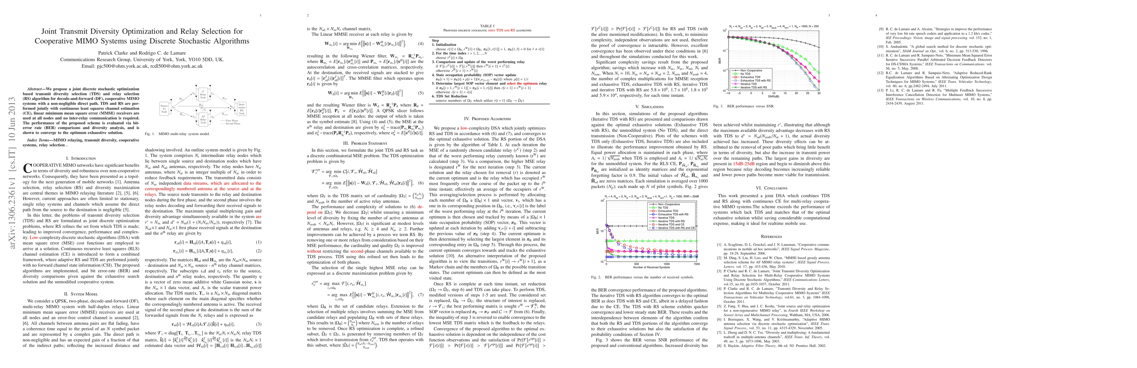 We propose a joint discrete stochastic optimization based transmit diversity selection (TDS) and relay selection (RS) algorithm for decode-and-forward (DF), cooperative MIMO systems with a non-negligible direct path. TDS and RS are performed jointly with continuous least squares channel estimation (CE), linear minimum mean square error (MMSE) receivers are used at all nodes and no inter-relay communication is required. The performance of the proposed scheme is evaluated via bit-error rate (BER) comparisons and diversity analysis, and is shown to converge to the optimum exhaustive solution.