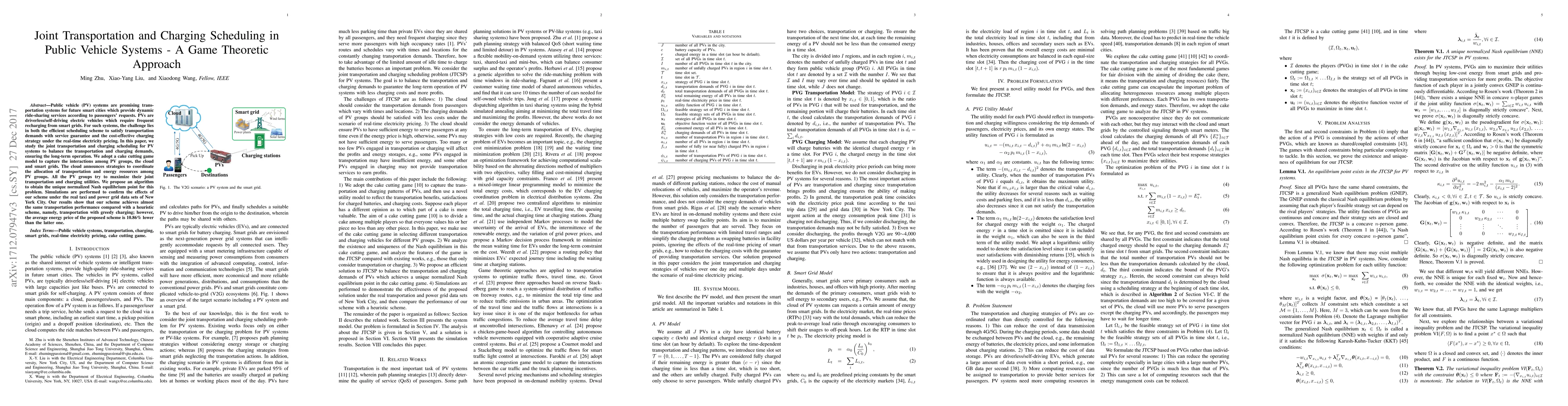 This paper proposes a game theoretic approach to jointly schedule transportation and charging for public vehicle systems in smart cities, aiming to balance transportation and charging demands efficiently. The study introduces a cake cutting game model to coordinate resource allocation and presents an algorithm to achieve a unique Nash equilibrium, demonstrating cost-effective charging with a 10.86% lower energy price compared to a greedy charging strategy.