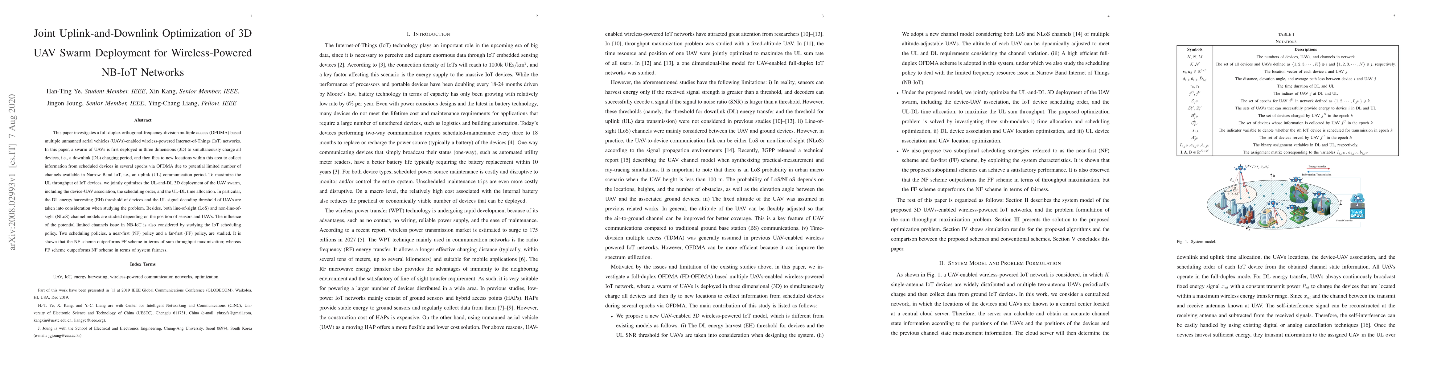 This paper optimizes 3D UAV deployment for wireless-powered IoT networks using OFDMA, balancing uplink and downlink operations to maximize IoT device throughput while considering energy harvesting thresholds and channel models.