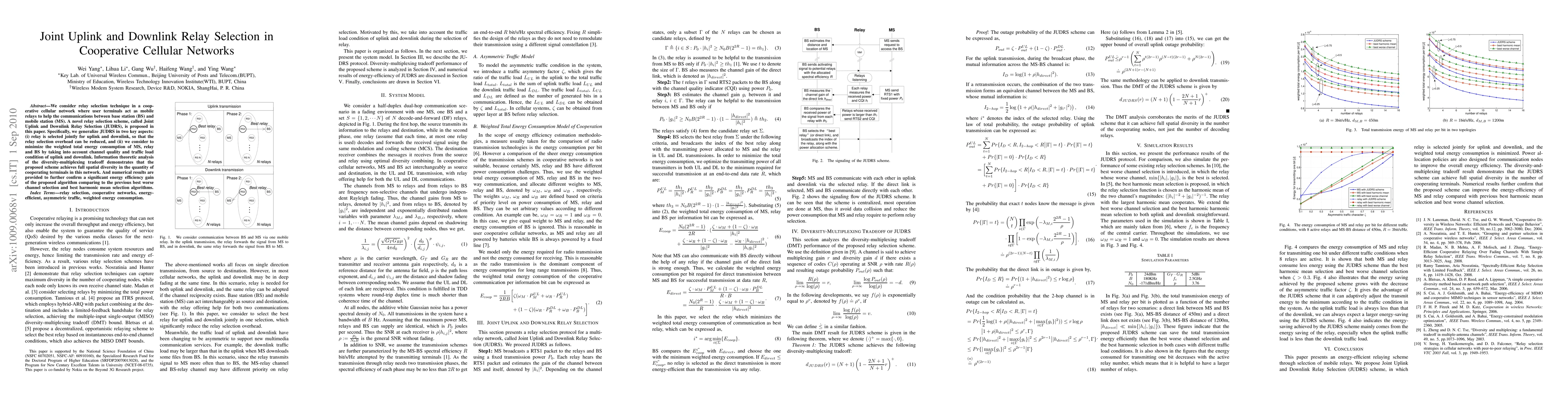This paper proposes a novel Joint Uplink and Downlink Relay Selection (JUDRS) scheme to optimize relay selection in cooperative cellular networks, aiming to reduce relay selection overhead and minimize energy consumption by considering channel quality and traffic load. The proposed method achieves full spatial diversity and demonstrates significant energy efficiency gains compared to existing algorithms.